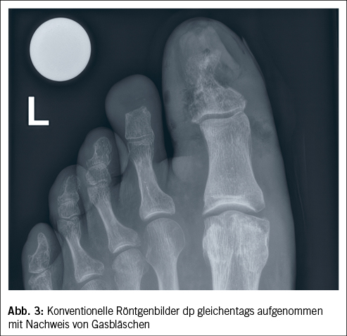 Ein Weichteilinfekt sollte anhand definierter klinischer Kriterien diagnostiziert werden (36). Bei Fehlen dieser klinischen Kriterien für eine Weichteilinfektion und bei Fehlen einer Osteomyelitis sollte auf die Gabe von Antibiotika verzichtet werden (37, 38). Der Verdachtsmoment einer Osteomyelitis kann durch die Kombination eines positiven «Probe-to-Bone-Test» (d.h. direkter Knochenkontakt einer durch die Wunde eingeführten sterilen Metallsonde), erhöhter laborchemischer Entzündungswerte sowie typischer Veränderungen in konventionellen Röntgenaufnahmen gestellt werden (36). Die Magnetresonanztomographie hat eine hohe Sensitivität in der Diagnostik einer Osteomyelitis (39) und dient bei der chirurgischen Planung in der präoperativen Bestimmung der Ausdehnung der Knochenbeteiligung (40). Zur Bestimmung des Schweregrades der Infektion wird die IWGDF/IDSA-DFI-Klassifikation empfohlen (36). Schwere Infektionen (d.h. alle Infektionen, die mit dem Vorhandensein von zwei oder mehr SIRS-Zeichen einhergehen) und moderate Infektionen (d.h. mehr als 2 cm Erythem um das DFU herum und/oder Gewebe tiefer als Haut und Subkutangewebe betroffen) mit relevanten Begleiterkrankungen wie schwere pAVK, Immunsuppression oder terminale Niereninsuffizienz sollten stationär behandelt werden (36). Ohne Knochenbeteiligung besteht die Therapie aus einem lokalen Debridement des infizierten Gewebes und einer Antibiotikatherapie von 1–2 Wochen nach Probenentnahme (36). Bei Nachweis einer Osteomyelitis kann zwischen einer konservativen Therapie (Antibiotika über 6 Wochen) und einer Entfernung des befallenen Knochens (was oftmals eine Amputation nach sich zieht, seltener eine innere Resektion nur des befallenen Knochens, bei der nur der infizierte Knochen entfernt wird [41]) abgewogen werden. Gasbildende Infekte, ausgedehnte Weichteilschäden, stark kompromittierte periphere Durchblutungsverhältnisse und Patientenfaktoren, die gegen eine 6 Wochen andauernde Antibiotikatherapie sprechen, lassen die Amputation bevorzugen. Insbesondere akrale Osteomyelitiden können erfolgreich konservativ therapiert werden (42). In naher Zukunft werden die Ergebnisse einer schweizerischen monozentrischen prospektiv-randomisierten Studie erwartet, im Rahmen derer die Antibiotikatherapiedauer bei diabetischen Fussinfektionen drastisch reduziert wurde (43). Das unter Abbildung 1–4 gezeigte Fallbeispiel zeigt einen 47 Jahre alten Patienten mit schlechter Adhärenz zur Entlastungstherapie mit dem Vollbild einer gasbildenden diabetischen Fussosteomyelitis, der septisch während der Nacht auf unserer Notfallstation vorstellig wurde. Die Therapie bestand in einer sofortigen Grosszehenamputation.
