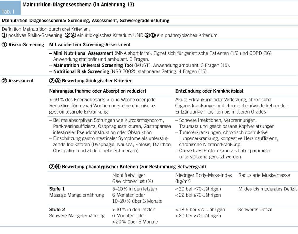 Bis 2019 gab es keine einheitlichen diagnostischen Kriterien für Malnutrition, und in der Literatur wurden unterschiedliche Definitionen verwendet (13, 14). Die Global Leadership Initiative on Malnutrition (GLIM) erarbeitete einen zweistufigen Ansatz (Tab. 1). Nach einem Screening zur Ermittlung des Risikostatus mithilfe eines validierten Screening-Assessments folgt als zweiter Schritt die Bewertung bestimmter Kriterien zur Diagnose der Malnutrition und zur Einstufung des Schweregrads der Mangelernährung (13).
