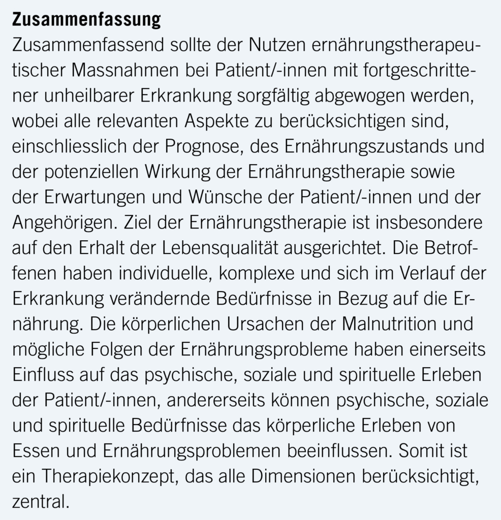 In der Praxis zeigt es sich heute immer noch, dass in der frühen Phase einer unheilbaren Erkrankung eine ernährungsmedizinische Betreuung häufig unterbleibt, und wenn die Erkrankung deutlich fortgeschritten ist und die klinischen Effekte einer Ernährungsintervention meist fraglich sind, kommt es dann zu einem unreflektierten Aktionismus mit entsprechender Überversorgung (1). Um zu ermöglichen, dass ernährungstherapeutische Massnahmen mit den Betroffenen diskutiert werden können, braucht das Gesundheitsfachpersonal gutes Fachwissen. Die Betroffenen sind darauf angewiesen, genügend Informationen zu erhalten, um Risiken, Vor- und Nachteile der Interventionen abwägen zu können (22). Hierzu gehören auch ganz praktische und personelle Voraussetzungen für die Verabreichung einer enteralen oder parenteralen Ernährung zu Hause.