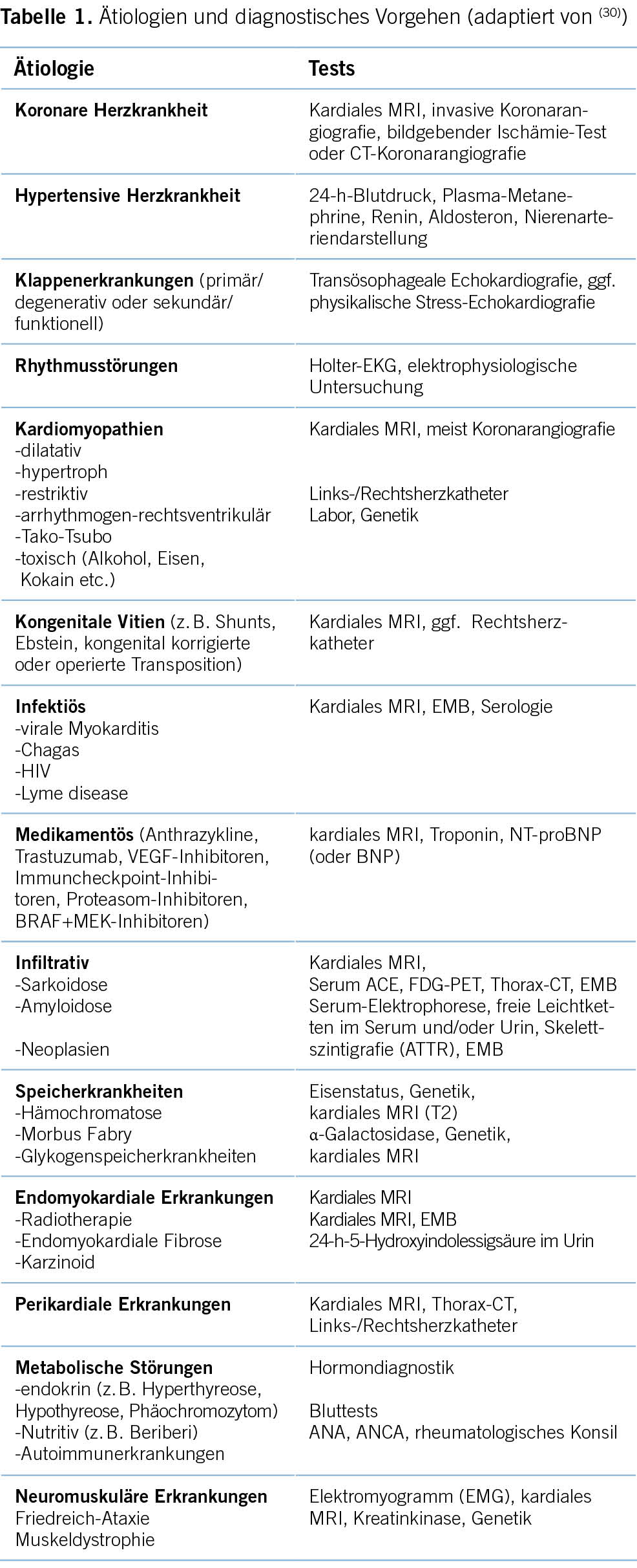 Da eine Herzinsuffizienz das Endstadium der meisten Herzerkrankungen darstellt, sind entsprechend viele Differentialdiagnosen zu berücksichtigen (Tabelle 1). Die häufigsten Ursachen wie eine koronare Herzerkrankung, arterielle Hypertonie, Klappenvitien oder Arrhythmien können bereits mit einfachen Massnahmen wie einer detaillierten Anamnese, körperlichen Untersuchung (inkl. Blutdruckmessungen), einem EKG und einer transthorakalen Echokardiografie eingegrenzt werden. Eine weitere Bildgebung mittels Magnetresonanztomografie ist in vielen Fällen sinnvoll. Verschiedene Ursachen einer Herzinsuffizienz wie eine Myokarditis, Sarkoidose, Amyloidose, Kardiomyopathien und weitere seltenere Entitäten können dadurch differenziert werden (5). Weiter hilft das MRT, bei ungenügender Echoschallqualität die EF genau zu bestimmen, und es kann das Ausmass der Fibrose zur Risikostratifizierung herangezogen werden (5). Abhängig vom kardiovaskulären Risikoprofil und der Vortestwahrscheinlichkeit kann eine koronare Genese mittels Koronarangiografie oder mittels Herz-CT gesucht werden. Besonders bei Kardiomyopathien, die nach eingehender Abklärung unklar bleiben, sollte eine genetische Ursache gesucht werden, welche in Abhängigkeit der Genmutation prognostische und somit therapeutische Implikationen, insbesondere auf die Primärprophylaxe des plötzlichen Herztodes, haben kann (5).