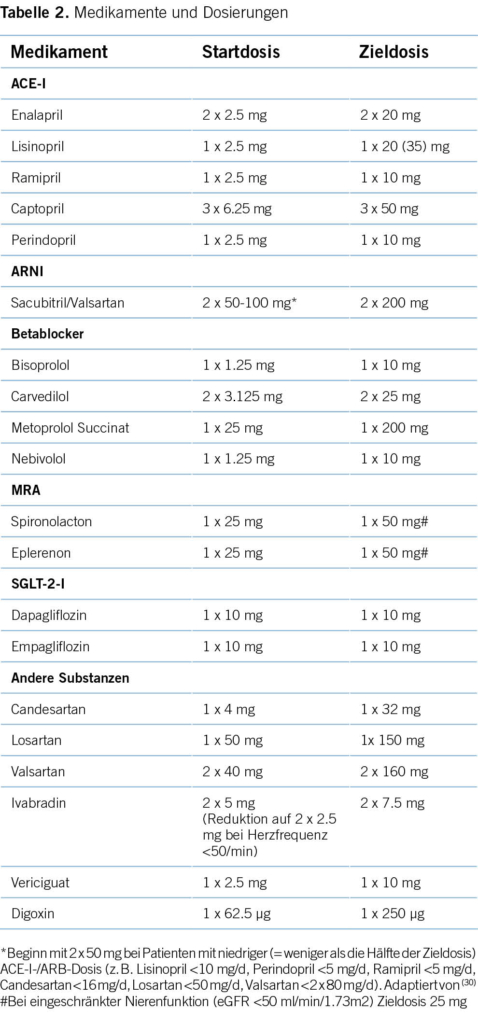 Die optimale Einleitung der Vierfachtherapie beruht derzeit auf Expertenmeinungen, wobei wissenschaftliche Evidenz und entsprechende Empfehlungen in den ESC-Leitlinien fehlen. Vermutlich ist die Reihenfolge der Medikamentenwahl weit weniger entscheidend, als dass versucht wird, alle Substanzklassen rasch zu starten. Bei niedrigem Blutdruck kann ein Beginn mit SGLT2-I und MRA sinnvoll sein, bei schlechter Nierenfunktion empfiehlt sich, zuerst Betablocker und SGLT2-I einzusetzen. Liegt eine Hypervolämie vor, lohnt es sich, mit SGLT2-I, MRA und ARNI vor Einsatz des Betablockers zu beginnen. Im ambulanten Setting werden nach Erstdiagnose einer HFrEF alle vier Substanzklassen in niedriger Dosis innerhalb von 2-4 Wochen gestartet und über weitere 2-4 Wochen in kleinen Schritten bis zur Zieldosis aufdosiert (s. Tabelle 2). Bei Patienten mit vorbestehender Hypotonie oder Niereninsuffizienz ist zur Vermeidung von Nebenwirkungen oft ein langsameres Vorgehen notwendig. Während der Einführungsphase sind engmaschige hausärztliche Kontrollen der Laborparameter (v. a. Kreatinin und Kalium) sowie Beurteilung der Volämie notwendig. Häufig sinkt nach Etablierung dieser Vierfachtherapie der Diuretikabedarf durch die Verbesserung der Hämodynamik und additive diuretische Wirkung von MRA, SGLT-2-I und ARNI. Nach Spitalaustritt sollte bei einem weiteren Gewichtsverlust, klinischen Zeichen der Hypovolämie oder Kreatininanstieg ohne Zeichen einer erneuten Dekompensation die Diuretikadosis rasch reduziert werden, was im besten Fall durch den gut informierten Patienten in Eigenregie erfolgt.