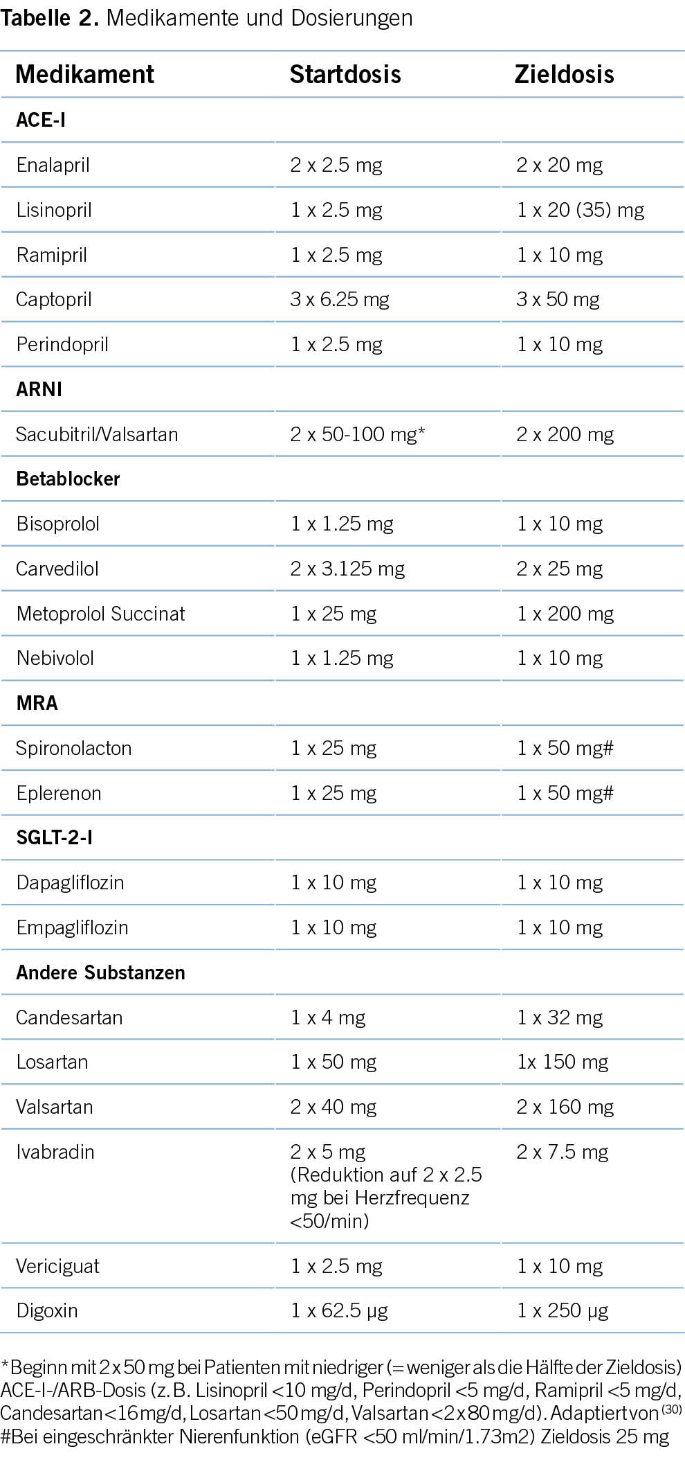 Die medikamentöse Therapie ist der Grundstein einer erfolgreichen Herzinsuffizienzbehandlung mit dem Ziel, die Mortalität und Hospitalisationsrate zu reduzieren sowie die Lebensqualität zu verbessern. Das bei Herzinsuffizienz verminderte Schlagvolumen führt zu langfristig ungünstigen Kompensationsmechanismen wie die sympatho-adrenerge Stimulation und Aktivierung des Renin-Angiotensin-Aldosteron-Systems (RAAS). Dies verbessert kurzfristig die Herzleistung, führt aber zu einer Negativspirale mit weiterer myokardialer Zellschädigung. Die Pharmakotherapie der Herzinsuffizienz ist darauf ausgerichtet, diese maladaptiven Prozesse positiv zu modulieren und basiert auf den 4 Substanzgruppen Angiotensin-II-Rezeptor-Neprilysin-Inhibitoren (ARNI), Betablocker (BB), Mineralokortikoid-Rezeptor-Antagonisten (MRA) und Sodium-Glucose Co-transporter-2 Inhibitoren (SGLT2-I). Auf die sogenannten «fantastischen Vier» wird im Folgenden näher eingegangen. Die gängigen Therapeutika mit Start- und Zieldosierung sind in Tabelle 2 aufgelistet.