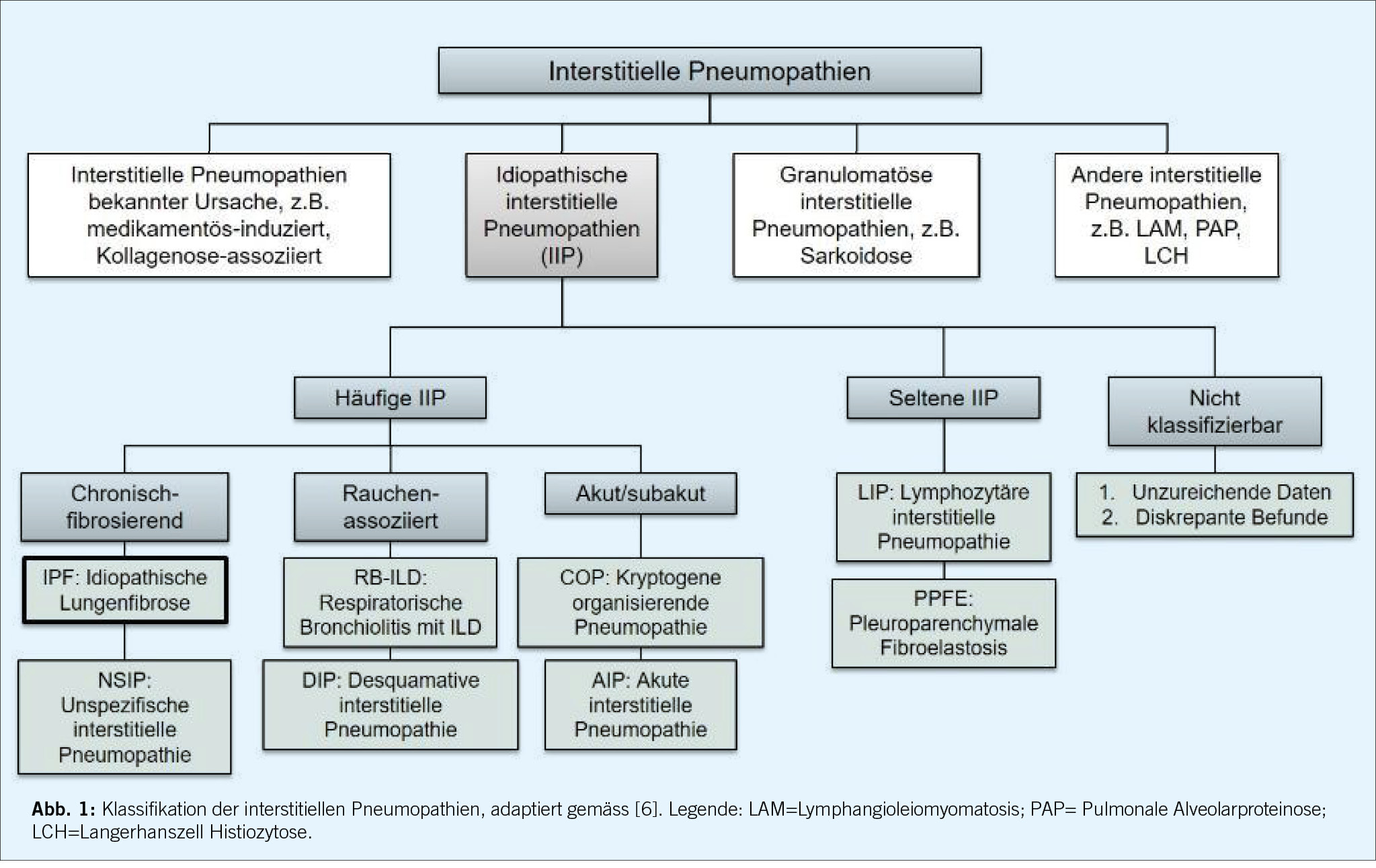 Bereits im 19. Jahrhundert wurden durch die Pathologen Georg Eduard von Rindfleisch und David Paul von Hansemann fibrosierende interstitielle Lungenerkrankungen beschrieben. 1935 beobachteten Louis Hamman und Arnold Rich vom Johns Hopkins Hospital mehrere Fälle von akuten und schweren Verläufen bei Patient/-innen mit Lungenfibrose, und wurden damit Namensgeber des “Hamman-Rich-Syndroms”. Eine erste Klassifikation der interstitiellen Pneumopathien entstand in den 60-er Jahren des letzten Jahrhunderts [5], und diese wurde seither mehrfach überarbeitet und durch neu beschriebene Entitäten erweitert. Die letzte offizielle Klassifikation, welche von Expertinnen und Experten im Auftrag der Amerikanischen und Europäischen Gesellschaften für Pneumologie erarbeitet worden ist, wurde 2013 publiziert und gliedert die interstitiellen Pneumopathien in vier Hauptgruppen: 1. Interstitielle Pneumopathien bekannter Ursachen, 2. idiopathische interstitielle Pneumopathien, 3. granulomatöse interstitielle Pneumopathien und 4. andere Entitäten (Abbildung 1) [6]. Zu den interstitiellen Pneumopathien mit bekannter Ursache gehören unter anderem die Konnektivitiden-assoziierten Erkrankungen, die Pneumokoniosen (ausgelöst durch die meist beruflich bedingte Inhalation anorganischer Stäube), oder die medikamentös-induzierten Pneumopathien. Die idiopathischen interstitiellen Pneumopathien (IIP) werden weiter aufgeteilt in häufige, seltene und nicht klassifizierbare Erkrankungen, wobei die erst 2004 erstmals beschriebenen Pleuroparenchymale Fibroelastosis ein Beispiel einer neu in die Klassifikation aufgenommenen seltenen IIP ist [7]. Die idiopathische pulmonale Fibrose (IPF) ist sowohl die häufigste IIP als auch diejenige interstitielle Pneumopathie mit dem ungünstigsten Krankheitsverlauf, aber auch jene, für welche bezüglich Therapie am meisten Evidenz vorliegt.