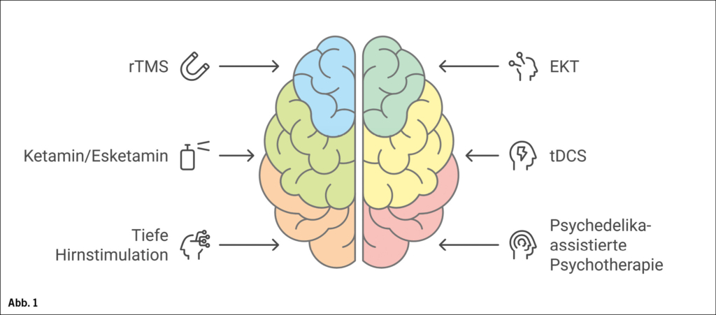 Depressionen gehören zu den affektiven Störungen und sind durch die Kernsymptome niedergedrückte Stimmung, Freudlosigkeit und Antriebsmangel gekennzeichnet. Die Wahrscheinlichkeit, im Laufe des Lebens mindestens einmal an einer depressiven Episode zu erkranken, liegt bei 16–20 % (1). Damit gehören Depressionen zu den häufigsten psychischen Erkrankungen. Depressionen werden mit Psychotherapie oder Antidepressiva und bei mittelschwerer und schwerer Ausprägung mit Kombination von Antidepressiva und Psychotherapie behandelt. Pharmakologische und psychotherapeutische Behandlungen sind effiziente Verfahren zur Behandlung von Depressionen. Die Wahrscheinlichkeit, auf eine Behandlung mit einem Antidepressivum anzusprechen und eine Remission zu erreichen, liegt während einer depressiven Episode bei einem ersten Behandlungsversuch bei 36 % und fällt bei einem zweiten Versuch auf 30 %, während bei einem dritten oder vierten Behandlungsversuch nur noch 13 % der Patientinnen und Patienten mit Depression ansprechen (2). Unter dem Begriff der Therapieresistenz wird in der Regel ein fehlendes Ansprechen auf mindestens zwei Antidepressiva, die in hinreichender Dosis und Dauer eingenommen wurden, verstanden (3). Abzugrenzen ist die Pseudotherapieresistenz; eine scheinbare Resistenz, die u. a. durch Fehldiagnosen, nicht erkannte psychiatrische Komorbiditäten, somatische Begleiterkrankungen, fehlende Therapie-Compliance oder insuffiziente Medikamentenspiegel bedingt ist. Der Begriff der «Therapieresistenz» geht jedoch mit einer negativen, pessimistischen Konnotation einher. Zudem ist die Implikation, dass nicht geholfen werden kann, inhaltlich nicht gerechtfertigt, da es neue Entwicklungen und innovative Behandlungsmethoden gibt. Daher wird das Konzept der schwer behandelbaren Depression in der letzten Zeit bevorzugt. Der Bereich der interventionellen Psychiatrie umfasst innovative und wirksame Hirnstimulationsverfahren, die die pharmakologische und psychotherapeutische Standardtherapie ergänzen. Im Folgenden soll eine Übersicht über verschiedene Verfahren der interventionellen Psychiatrie und neuartige Substanzen gegeben werden (Abb. 1).