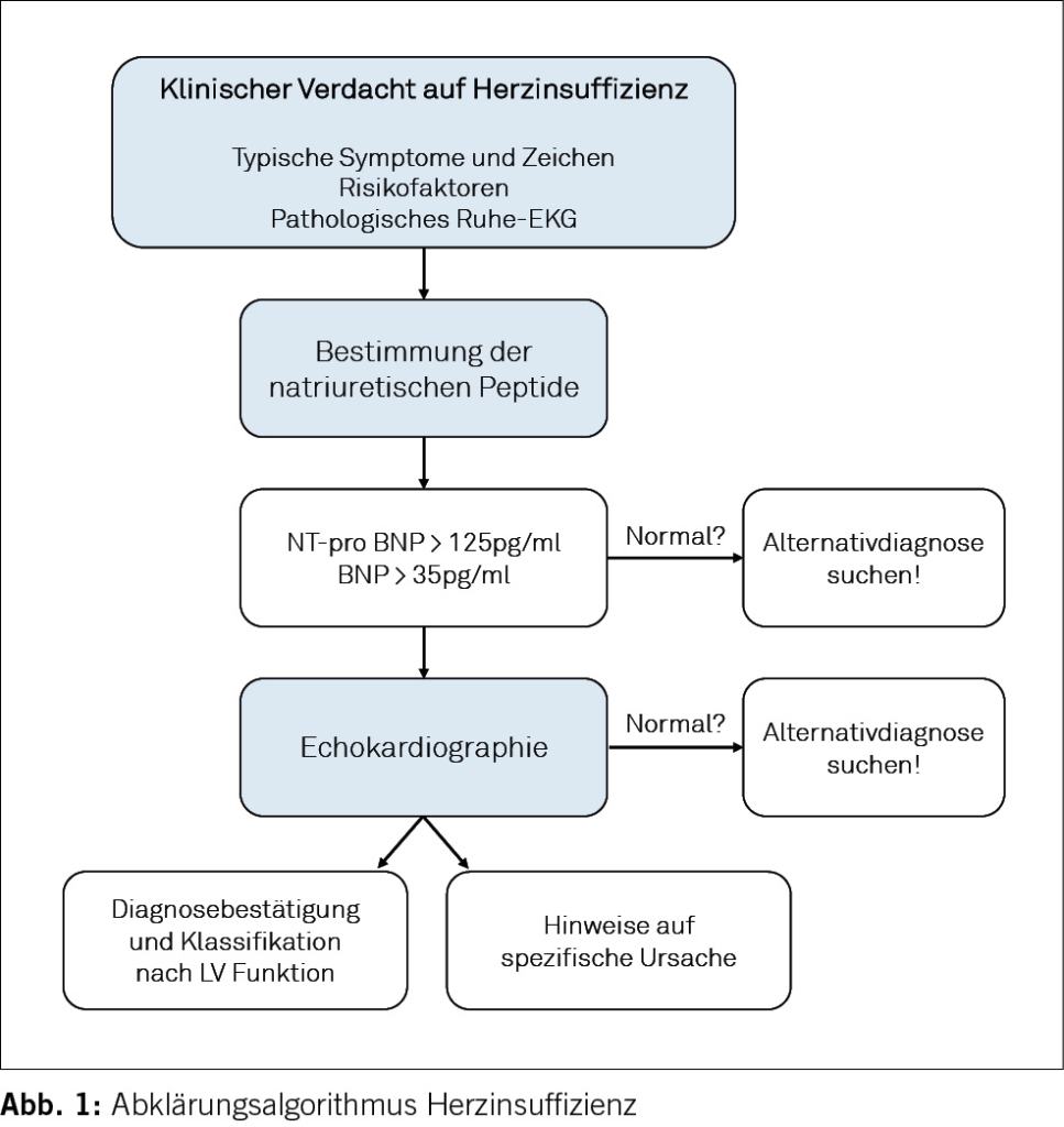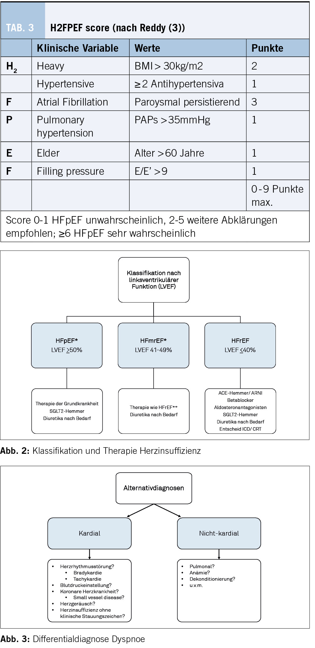 Der Algorithmus der European Society of Cardiology (2, Abbildung 1) sieht bei typischen klinischen Zeichen und Symptomen der HI eine Bestimmung der natriuretischen Peptide vor. Bei tiefen Werten ist eine HI mit hoher Sicherheit ausgeschlossen (NT-pro BNP <125pg/ml oder BNP <35pg/ml). Im anderen Fall sollte mit einer Echokardiographie eine strukturelle Herzkrankheit gesucht werden. Der echokardiographische Phänotyp stellt die Weichen zur weiteren differentialdiagnostischen Abklärung. Die Bestimmung der linksventrikulären Ejektionsfraktion (LVEF) ist wesentlich zur Festlegung der weiteren Therapie (Abbildung 2). Die Diagnose einer HI mit erhaltener Pumpfunktion kann bei fehlenden Stauungszeichen mithilfe von validierten Scores wie dem H2FPEF-Score (3) (s. Tabelle 3) erleichtert werden.