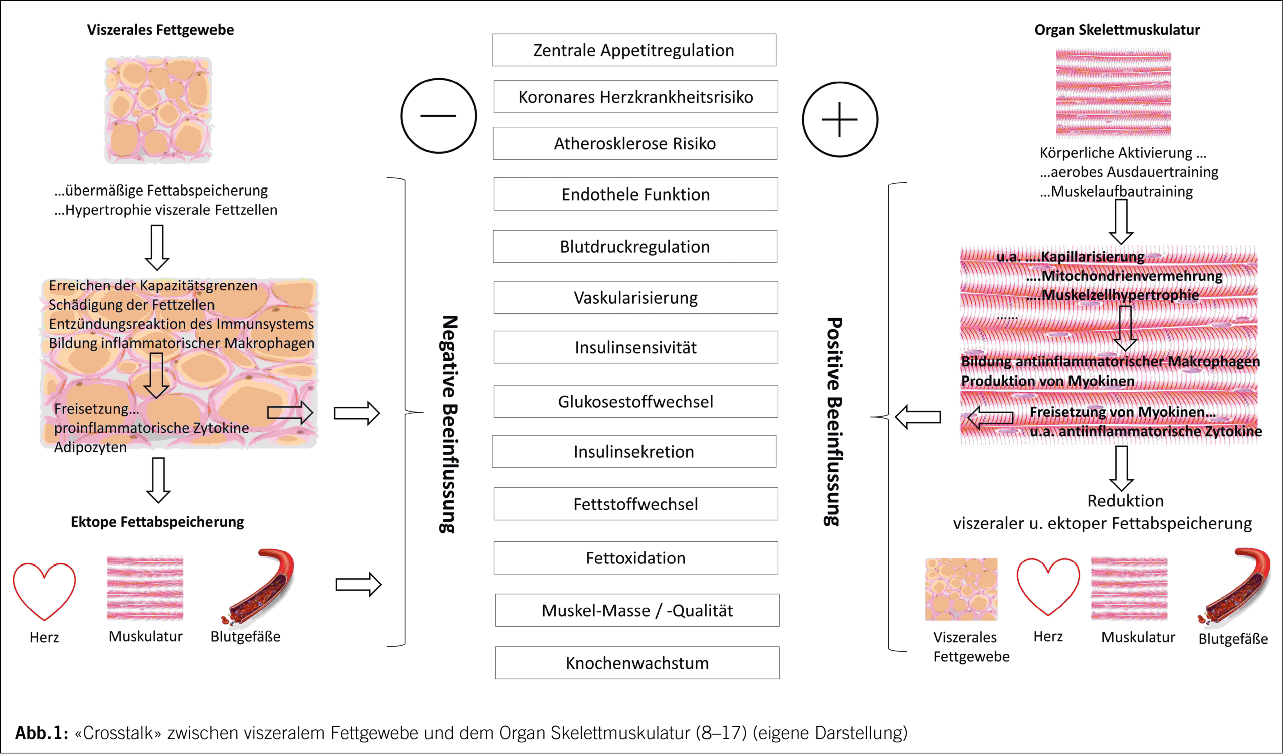 Wie in Abbildung 1 zu erkennen ist, kann das aktive Organ Skelettmuskulatur der übermässigen viszeralen Fettanhäufung, der daraus resultierenden chronischen subklinischen systemischen Entzündung und den damit verbundenen kardiometabolischen Risikofaktoren entgegenwirken.