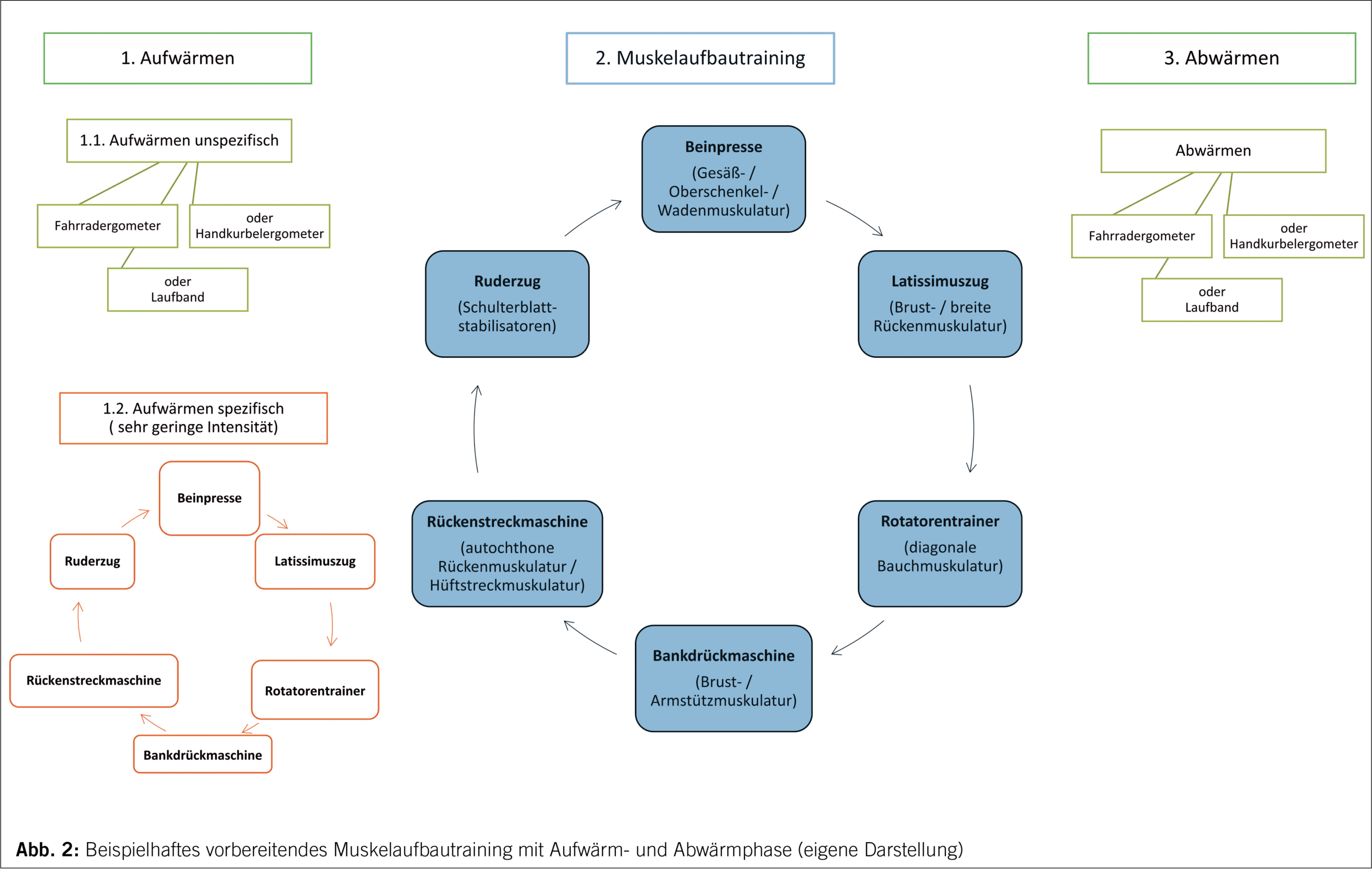 Wie in Abbildung 2 zu erkennen ist, geht dem eigentlichen Muskelaufbautraining eine Aufwärmphase voraus. Diese unterteilt sich in eine allgemeine Vorbereitung für das Herz-Kreislauf-System und eine spezifische für die beanspruchten Muskelgruppen und Gelenke. Danach erfolgt das eigentliche Muskelaufbautraining. Die Übungsreihenfolge sorgt dafür, dass es zu keiner vorzeitigen Ermüdung einzelner Muskelgruppen durch redundante Beanspruchung kommt. Am Ende des Trainings steht die Abwärmphase. Diese dient der Einleitung der Regenerationsphase, die für das Krafttraining mindestens einen Tag beansprucht. Erst in der Regenerationsphase finden die qualitativen und quantitativen Anpassungseffekte statt.