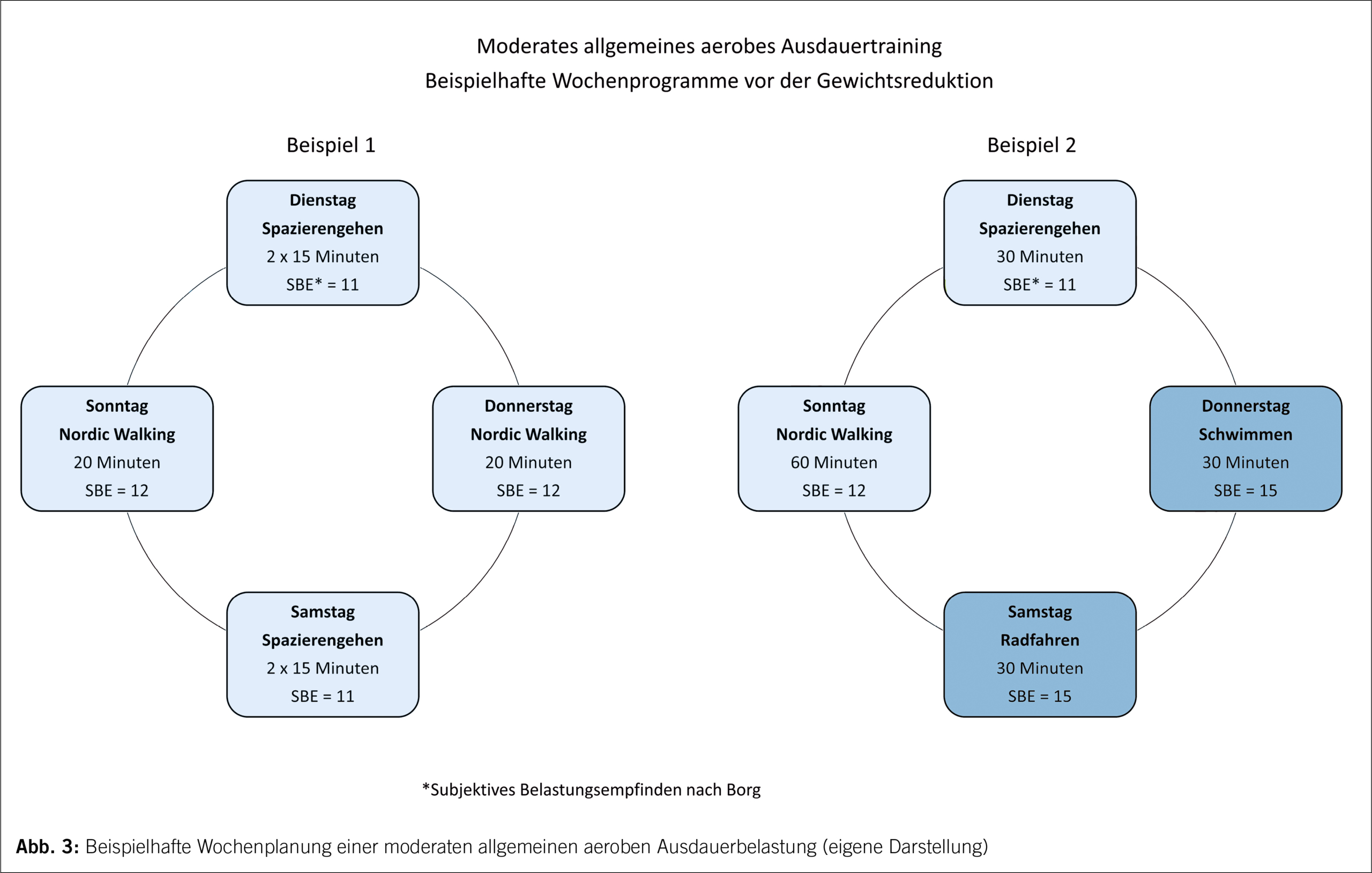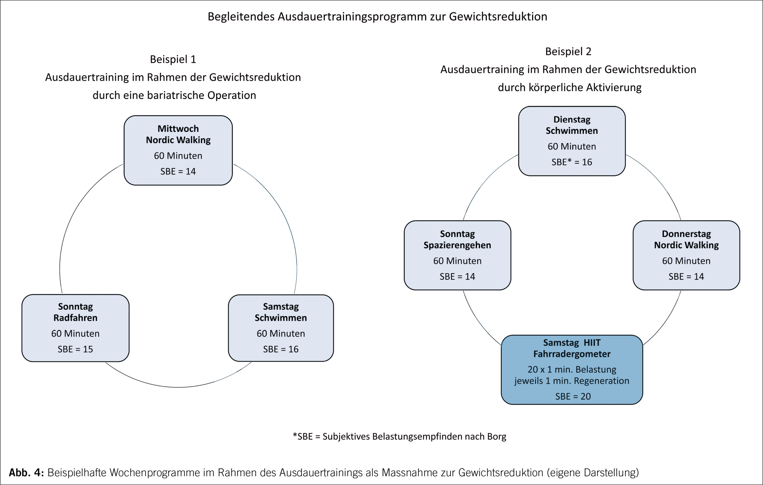 In Abbildung 4 ist beispielhaft jeweils eine Trainingswoche für ein Ausdauertraining zur Begleitung der durch eine bariatrische Intervention erzielten Gewichtsreduktion (Beispiel 1) oder als eigenständiges Trainingsprogramm zur Gewichtsreduktion (Beispiel 2) dargestellt. Die Belastungsdosierung orientiert sich an dem subjektiven Belastungsempfinden nach Borg (Tabelle 4).