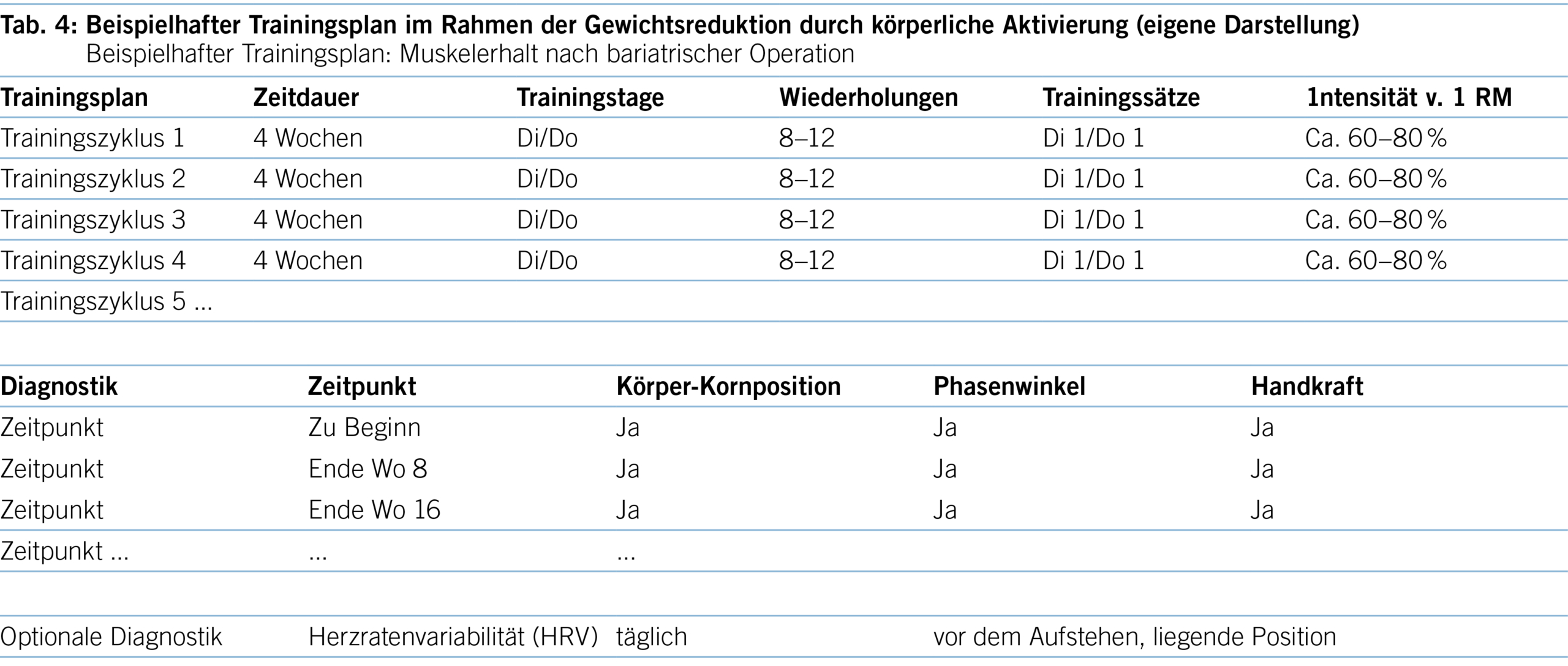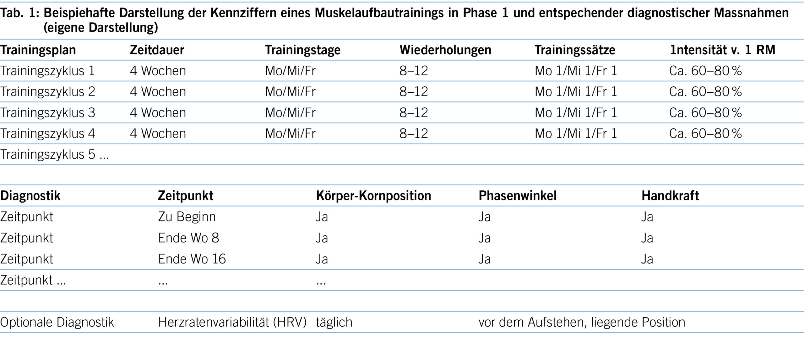Tabelle 1 stellt beispielhaft die Kennziffern, Belastungsparameter und diagnostischen Massnahmen im Rahmen der praktischen Umsetzung der gesammelten Erkenntnisse dar. Trainiert wird jeweils an drei nicht aufeinanderfolgenden Tagen pro Woche. In den ersten Trainingswochen genügt ein Trainingssatz pro Übung mit 8–12 Wiederholungen bis zur jeweiligen Ermüdung der beanspruchten Muskelgruppe. Dies entspricht einer Trainingsintensität von 60–80 % des 1-RM. Die Anpassung des Trainingsgewichtes orientiert sich hierbei an der Wiederholungszahl. Das bedeutet, dass eine Beanspruchung von in etwa 80% erreicht wird, wenn 8 Wiederholungen unter muskulärer Auslastung durchgeführt werden können. Eine Beanspruchung von 60% der 1-RM entspräche dann 12 Wiederholungen unter muskulärer Auslastung.