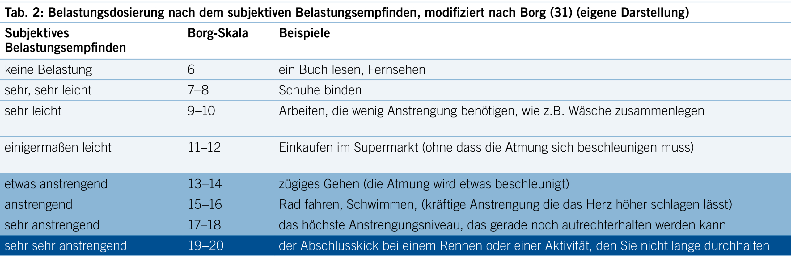 Die in Tabelle 2 empfohlene Belastungsdosierung nach dem subjektiven Belastungsempfinden nach Borg (31) kann Anwendung in der praktischen Umsetzung eines moderaten allgemeinen aeroben Ausdauertrainings finden, wie es beispielhaft in Abbildung 3 dargestellt wird.