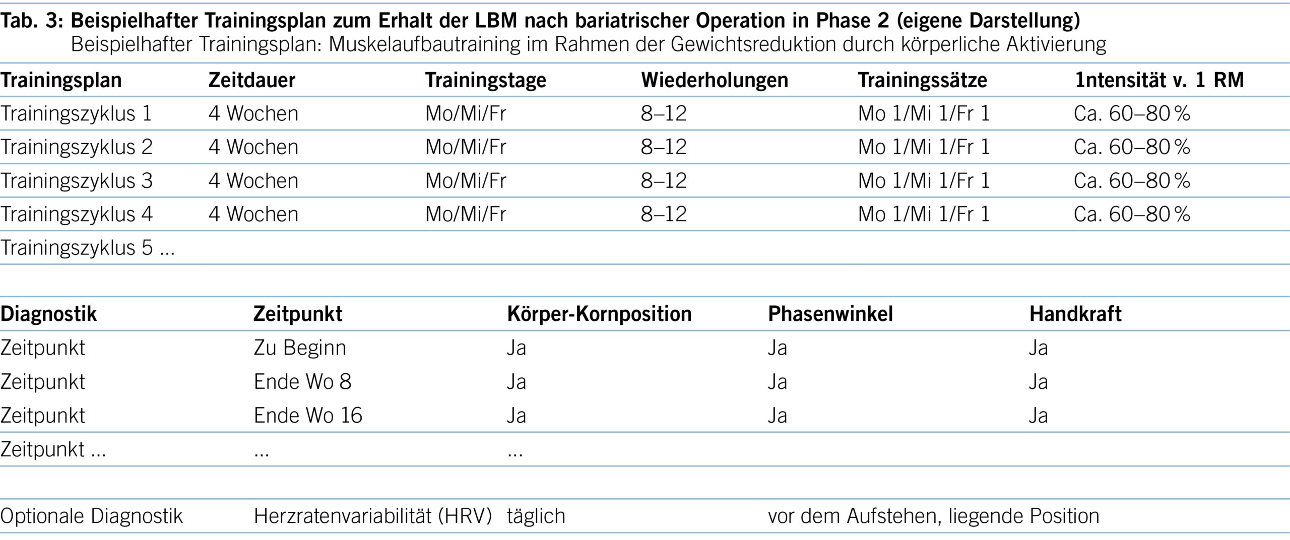 Aufgrund der dargestellten Erkenntnisse sollte ein Muskelaufbautraining nach bariatrischer Operation langfristig angelegt werden und zwei Trainingseinheiten pro Woche beinhalten (siehe Tabelle 3). Dies entspricht auch den Vorgaben eines gesundheitsorientierten Krafttrainings (30). Eine ausreichende Eiweisszufuhr ist zum Erhalt der LBM essenziell (23).