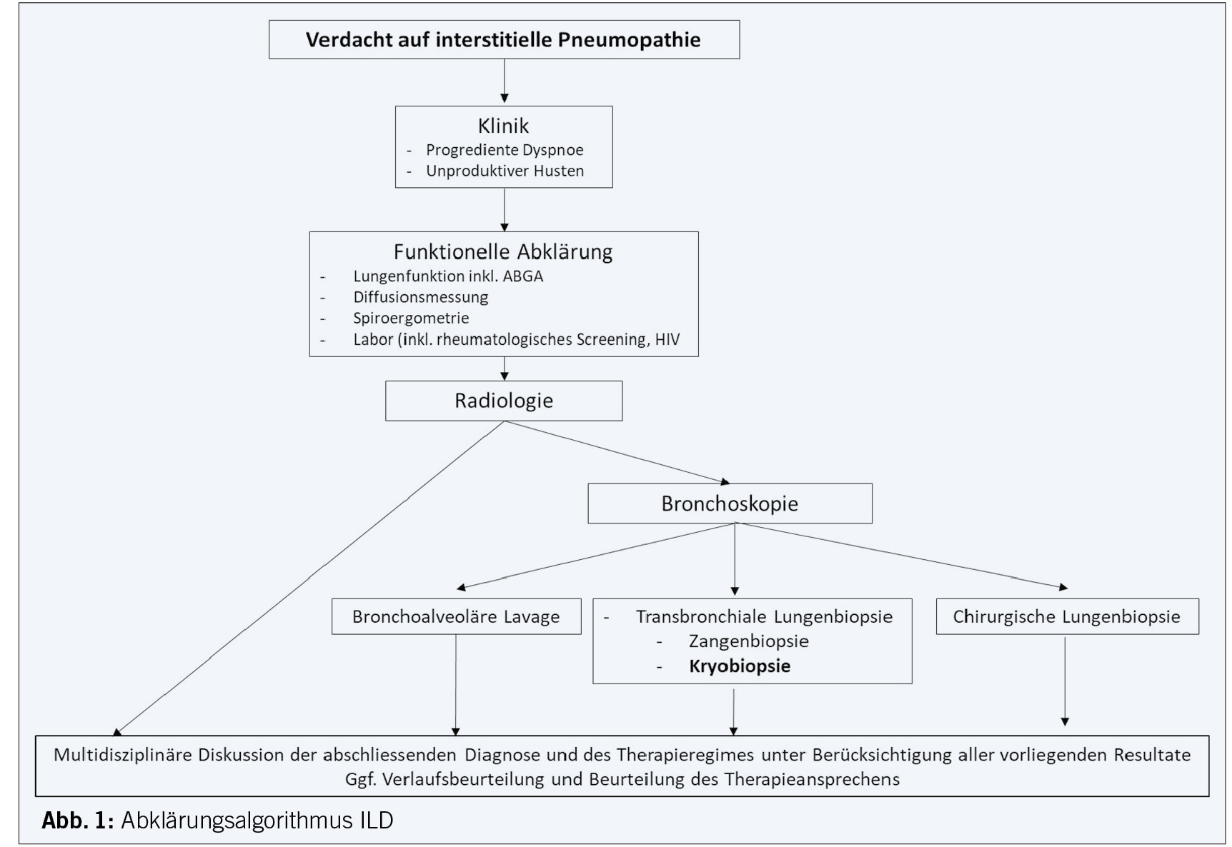 Sofern im Rahmen einer interdisziplinären Besprechung keine affirmative Diagnose unter Berücksichtigung der Klinik, des Labors und der Bildgebung zu stellen ist, wäre als nächster Schritt eine Lungenspiegelung vorgesehen (Abbildung 1).