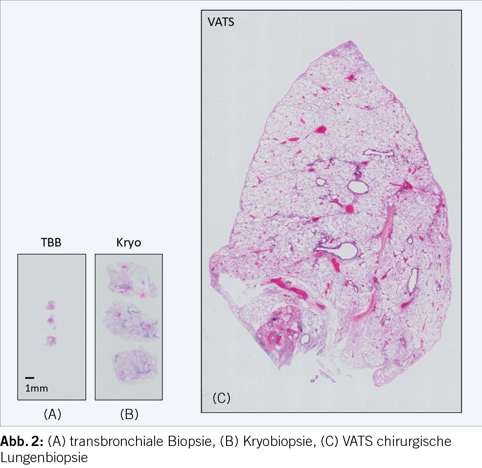 Als vielversprechenden semiinvasiven Kompromiss zwischen einer TBB und der chirurgischen Lungenbiopsie hat sich die transbronchiale Kryobiopsie etabliert. Diese Untersuchung kann in flexibler oder starrer Endoskopie am intubierten Patienten durchgeführt werden und liefert parenchymatöse Biopsien von mehreren Millimetern Kantenlänge (ca. 3x3x3mm) (Abbildung 2). Unter tiefer Sedierung oder in Allgemeinanästhesie wird ein Metalltip, mit einem Durchmesser von 1.9 oder 2.4mm, mit einem Guidewire über ein therapeutisches Endoskop mit grossem Arbeitskanal unter Durchleuchtung in das Zielgebiet geführt. Hierbei sollte mit einem Abstand von ca. 1-2 cm zur Pleura die Sonde positioniert werden. Je weiter peripher man sich befindet, desto grösser ist das Pneumothoraxrisiko und je weiter zentral der zu biopsierende Ort liegt, erhöht sich das Blutungsrisiko erheblich. Nach Platzierung der Sonde wird durch das Kryogas (z.B. Stickstoffdioxid, Kohlendioxid) für 5 bis 7 Sekunden Kälte appliziert. Dabei friert das Lungengewebe um die Metallspitze. Nachfolgend wird die Sonde zurückgezogen und das gefrorene Material geborgen und für die Analyse direkt in Formalin fixiert und kann dann in Paraffin eingebettet und für weitere Färbungen verarbeitet werden. Immunhistochemische Untersuchungen und molekulare Analysen können wie bei der chirurgischen Biopsie durchgeführt werden. Die Diagnosestellung kann durch die minimal invasive Methode der Kryobiopsie von 65% auf 93% gesteigert werden, wie Ravagalia an einer Kohorte von 699 Patienten nachweisen konnte. Zur Minimierung der Blutungskomplikationen durch Gefässläsionen im Kryobereich wird endobronchial ein Ballon (z.B. Fogarty) vorgelegt, welcher direkt nach der Kryobiopsie aufgeblasen wird, um das Segment zu verschliessen und eine lokale Blutstillung zu ermöglichen. Der Anteil an «sampling error» wird auf ca. 20% geschätzt, wobei es sich hierbei vor allem um Material mit unzureichendem alveolären Parenchymanteil oder ausschliesslich um Bronchialwandanteile handelt. Daher wird in den aktuellen Leitlinien eine Entnahme von drei (bis max. fünf) Kryobiopsien empfohlen. Die transbronchiale Kryobiopsie sollte an Zentren mit Expertise in dieser Technik und mit intensivmedizinischem Background erfolgen.