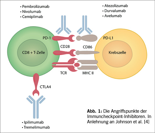 ICI stellen durch Bindung der Immuncheckpoints als monoklonale Antikörper eine therapeutische Möglichkeit dar, den hemmenden Einfluss der Immuncheckpoints auf die T-Zell-vermittelte Tumorabwehr aufzuheben und somit die Sichtbarkeit der Tumorzellen für das Immunsystem zu verbessern.