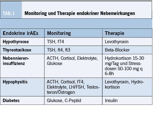 Zu den endokrinen irAEs gehört die Hypophysitis, die Schilddrüsendysfunktion, der Diabetes Typ I und die Nebenniereninsuffizienz. Endokrine Nebenwirkungen treten vergleichsweise früh auf, beispielsweise tritt im Median vier bis sechs Wochen nach Therapiebeginn eine Thyreotoxikose mit folgender Hypothyreose auf [23]. Während die Hypophysitis selten ist und häufiger bei Kombinationstherapien aus Nivolumab und Ipilimumab (6.4%) beobachtet wird, kommt die Thyreoiditis häufiger bei PD-1/PD-L1 Inhibition vor und wurde in bis zu 10% der Patienten beobachtet [4, 24]. Die Hypophysitis zeigt sich durch Kopfschmerzen, Fatigue, Muskelschwäche, Gewichtsverlust, Obstipation und Symptome der Hypothyreose bei Beteiligung der thyreoidalen Hormonachse oder auch mit erektiler Dysfunktion und Amenorrhoe bei Beeinträchtigung der gonadalen Hormonachse [25]. Bei 48 Patienten, die Pembrolizumab bei NSCLC im Rahmen der Keynote 001 Studie erhielten, zeigte sich in 21% eine neu aufgetretene, therapiewürdige Schilddrüsendysfunktion, wobei eine transiente Hyperthyreose bei 6 von 10 Patienten vor Hypothyreose auffiel. Auffällig war das signifikant verlängerte Überleben bei Patienten mit thyreoidaler Dysfunktion (median 40 vs. 14 Monate HR 0.29; 95% CI 0.09-0.94) [26]. Bei 16.7% der Patienten, die bei unterschiedlichen Tumoren eine Behandlung mit Nivolumab oder Pembrolizumab erhielten, zeigte sich eine Schilddrüsendysfunktion. Auch hier konnte ein positiver Einfluss auf das Progressionsfreie Überleben (Median 66 vs. 27 Wochen, HR: 0.50, 95% CI: 0.26-0.89) und Gesamtüberleben (median: 156 vs. 59 Wochen, HR 0.34, 95% CI: 0.13-0.75) gezeigt werden [27]. In der Behandlung des malignen Melanoms zeigte sich eine höhere Inzidenz für eine Schilddrüsendysfunktion in der Kombinationstherapie aus PD-1 Inhibition und CTLA4-Inhibition mit 14.6% (gegenüber 3.6% bei CTLA4-Inhibition und 7.5% bei PD-1 Blockade) [26]. Nebenniereninsuffizienz und Diabetes Typ I wurden im Rahmen der Keynote-522 Studie bei 2.3% und 0.3% festgestellt, in deren Rahmen Pembrolizumab neoadjuvant begleitend zur Chemotherapie zur Behandlung des Triple-negativen Mammakarzinoms verabreicht wurde [28]. Endokrinologische Nebenwirkungen bedürfen keiner Behandlung mit Glukokortikoiden sondern einer Substitution von Schilddrüsenhormonen bei Hypothyreose, Insulin bei Diabetes Typ I oder Hydrokortison bei der Nebenniereninsuffizienz, da es nicht selten zur dauerhaften Einschränkung der endokrinen Organfunktion kommt und diese nicht durch die Gabe von Steroiden verhindert werden kann.