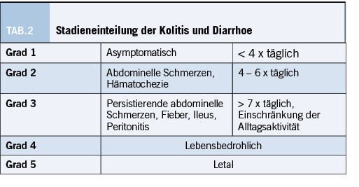 Gastrointestinale Nebenwirkungen betreffen 30-40% der Patienten und zeigen sich als Diarrhoe, Kolitis, Hepatitis, Pankreatitis oder auch selten Ösophagitis, Mukositis, Xerostomie und Zöliakie. Während die Kolitis bei PD-1/PDL-1 Inhibition selten (5%) beobachtet wird, kommen Diarrhoe und Kolitis bei CTLA-4 Inhibition häufiger vor [11]. Entzündliche Darmerkrankungen treten im Median nach 8-16 Wochen auf, während die Hepatitis im Median nach 13-22 Wochen auftritt [23]. Die Kolitis geht im Gegensatz zur Diarrhoe mit abdominellen Schmerzen, Hämatochezie sowie objektivierbarem Nachweis einer Darmschleimhautentzündung mit Erythem und Ulzeration einher und sollte zur Diagnosesicherung bioptisch gesichert werden [25]. Zur Therapie werden primär Glukokortikoide eingesetzt, wobei auch Infliximab und Vedolizumab in schwersten Fällen Einsatz finden können. Die Hepatitis kann nach Ausschluss relevanter Virusinfektionen bei erhöhten Transaminasen in Betracht kommen und sich asymptomatisch, mit Ikterus oder als akutes Leberversagen zeigen. Autoimmunhepatitis-Antikörper sind meistens negativ, jedoch kann bioptisch eine T-Zell-Invasion des Leberparenchyms festgestellt werden. Auch die Hepatitis kann mit Glukokortikoiden behandelt werden.