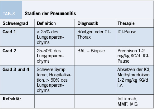 Im Pacific-Trial, wo der Anti-PD-L1 IgG1 Antikörper Durvalumab zur Therapie des NSCLC im Stadium III für zwölf Monate zur Konsolidation nach Radiochemotherapie verwendet wurde, konnte ein deutlicher Überlebensvorteil gegenüber dem Placebo gezeigt werden. Grad 3-4 Nebenwirkungen zeigten sich in 30.5% gegenüber 26.1% in der Placebo-Gruppe. Husten und Pneumonitis waren die häufigsten Nebenwirkungen mit 35.4% und 33.9% gegenüber 25.2% und 24.8% in der Placebo Gruppe [22]. Besonders toxisch scheinen Kombinationen aus ICI und zielgerichteten Therapien zu sein. [7, 23].