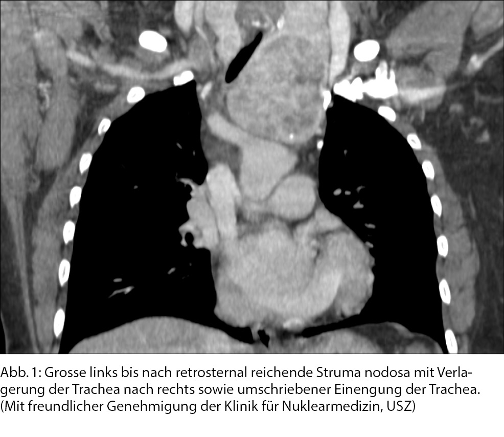Hier geht es vor allem um eine Volumenzunahme der gesamten Schilddrüse im Rahmen einer grössenprogredienten Struma diffusa oder beispielsweise bei einer Thyreoiditis de Quervain. Auch bei grössenprogredienten Knoten (gut- wie auch bösartig) kann es zu einer Kompressionsproblematik im Bereich des Übergangs «Schilddrüse zu Luftröhre» kommen, welche Atemnot verursachen kann. Schilddrüsenknoten sind eine häufige Krankheit und ihre Abklärung und Therapie ist heutzutage standardisiert (5). Essentiell ist es, eine saubere Anamnese und einen körperlichen (Schilddrüsen-) Untersuch durchzuführen, um auf eine allfällige Kompressionsproblematik aufmerksam zu werden. Eine einfache Spirometrie (6) kann auch weiterhelfen in der Diagnostik.