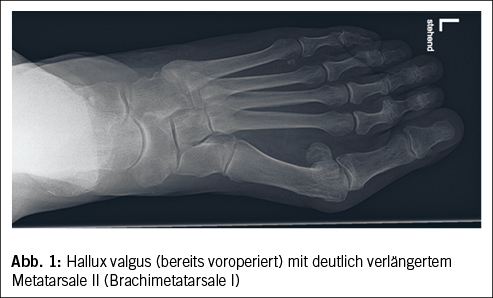 Ein sehr kurzes erstes Metatarsale, sog. Brachimetatarsale I, kann die Überlastung vom MTP-II- und -III-Gelenk zusätzlich verstärken (Abb. 1). Dieses führt ebenfalls zu einer relativen Überlänge der lateralen Strahlen im Verhältnis zum Metatarsale I.