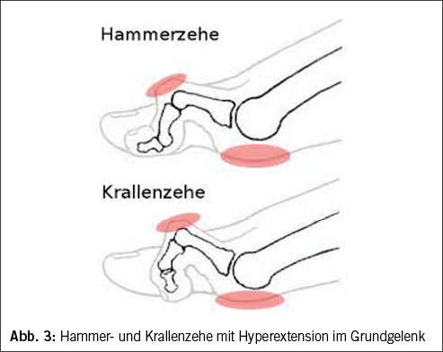 Durch eine zusätzliche Fehlstellung der Kleinzehen (Hammer-, Krallenzehen) kann es zu Entzündungen der kleinen Gelenke kommen (Abb. 3). Die Fehlstellung der Kleinzehen kann ausserdem durch die Überstreckung der Grundgelenke zu einer Verlagerung des plantaren Fettpolsters, weg von den Mittelfussköpfchen, führen, sodass die Dämpfung für die Köpfchen wegfällt.