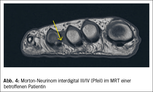 Eine unphysiologische Druckbelastung der Mittelfussknochen und der Raum zwischen den Metatarsalia kann zu einer Verdickung und Entzündung des darin verlaufenden Nervs führen (Abb. 4). Man spricht dann von einer Morton-Neuralgie oder einem Morton-Neurinom.