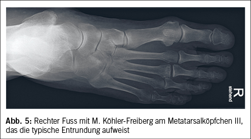 Beim Morbus Köhler II, auch Morbus Köhler-Freiberg genannt, handelt es sich um eine aseptische Knochennekrose der Metatarsalköpfchen II–V, wobei das 2. Metatarsalköpfchen am meisten betroffen ist. Durch die Nekrose kommt es zum Einbruch des Knochens und Deformität des Metatarsalköpfchens, was zur Arthrose im Metatarsophalangealgelenk führt (Abb. 5). Die Ursache für diese Durchblutungsstörung ist nicht schlüssig geklärt. Mikrotraumta und systemische Erkrankungen sind die häufigsten Erklärungen (7).
