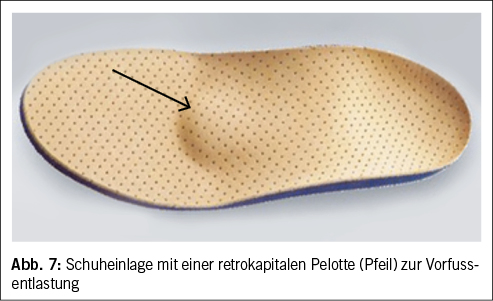 Reichen diese Massnahmen nicht aus, können orthopädische Einlagen verschrieben werden, welche den Fuss entsprechend unterstützen und den Vorfuss z.B. mit einer retrokapitalen Pelotte entlasten (Abb. 7).