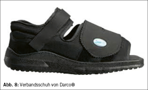 Das postoperative Procedere hängt davon ab, ob nur ein Weichteileingriff durchgeführt wurde oder ob man mittels Osteotomien die ossären Strukturen korrigieren musste. Die postoperative Ruhigstellung ist in beiden Fällen ein Verbandsschuh (Hallux-Schuh, Abb. 8). Die Tragedauer variiert je nach Eingriff zwischen zwei und sechs Wochen.