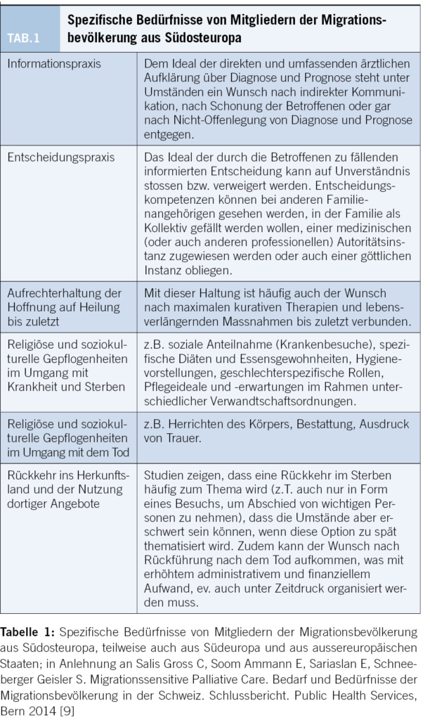 Die Berücksichtigung der individuellen Behandlungspräferenzen am Lebensende gehört zu den Hauptzielen einer guten palliativmedizinischen Versorgung. Man weiss, dass in den Ländern Mittel-und Nordeuropas, aber auch in den USA Mitglieder von Migrationspopulationen resp. ethnische Minoritäten bei weit fortgeschrittener Erkrankung eher intensivere und auf Kuration ausgerichtete Behandlung wünschen, als dies bei der im entsprechenden Land dominanten Bevölkerungsgruppe der Fall ist. Auf der anderen Seite erstellen Mitglieder dieser Minoritäten im Vergleich zur dominanten Bevölkerungsgruppe viel seltener Patientenverfügungen [19].