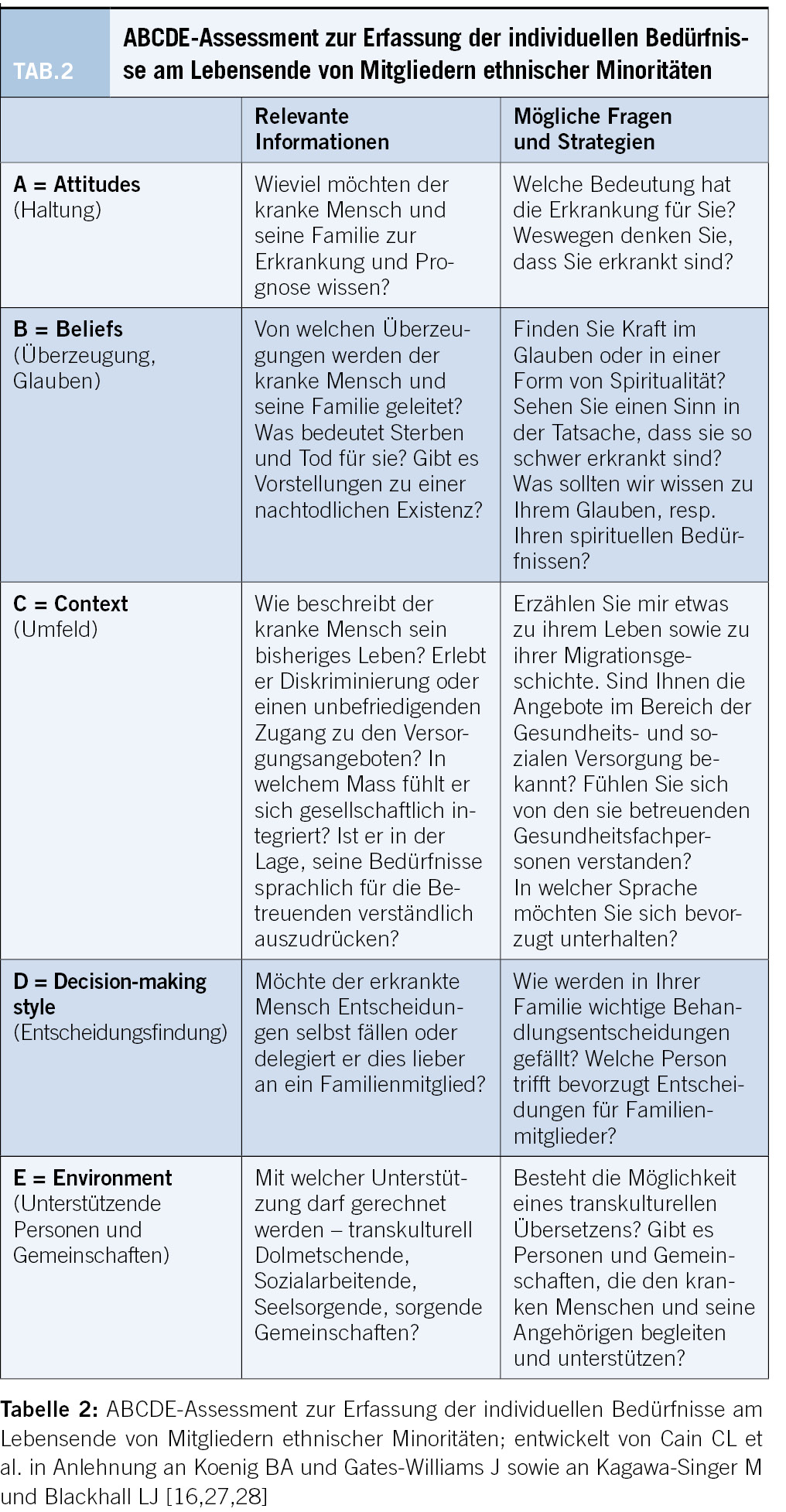 Für eine erste Orientierung eignet sich auch das von Cain CL et al. in Anlehnung an Koenig BA und Gates-Williams J sowie an Kagawa-Singer M und Blackhall LJ entwickelte Assessment mit dem Ziel, die individuelle Haltung der betroffenen Menschen und ihrer Angehörigen sowie deren Überzeugungen und ihren Glauben im entsprechenden Umfeld in Erfahrung zu bringen, wobei es auch darum geht, wie Personen Entscheidungen fällen und über welche Ressourcen sie verfügen (Tabelle 2) [16,27,28].