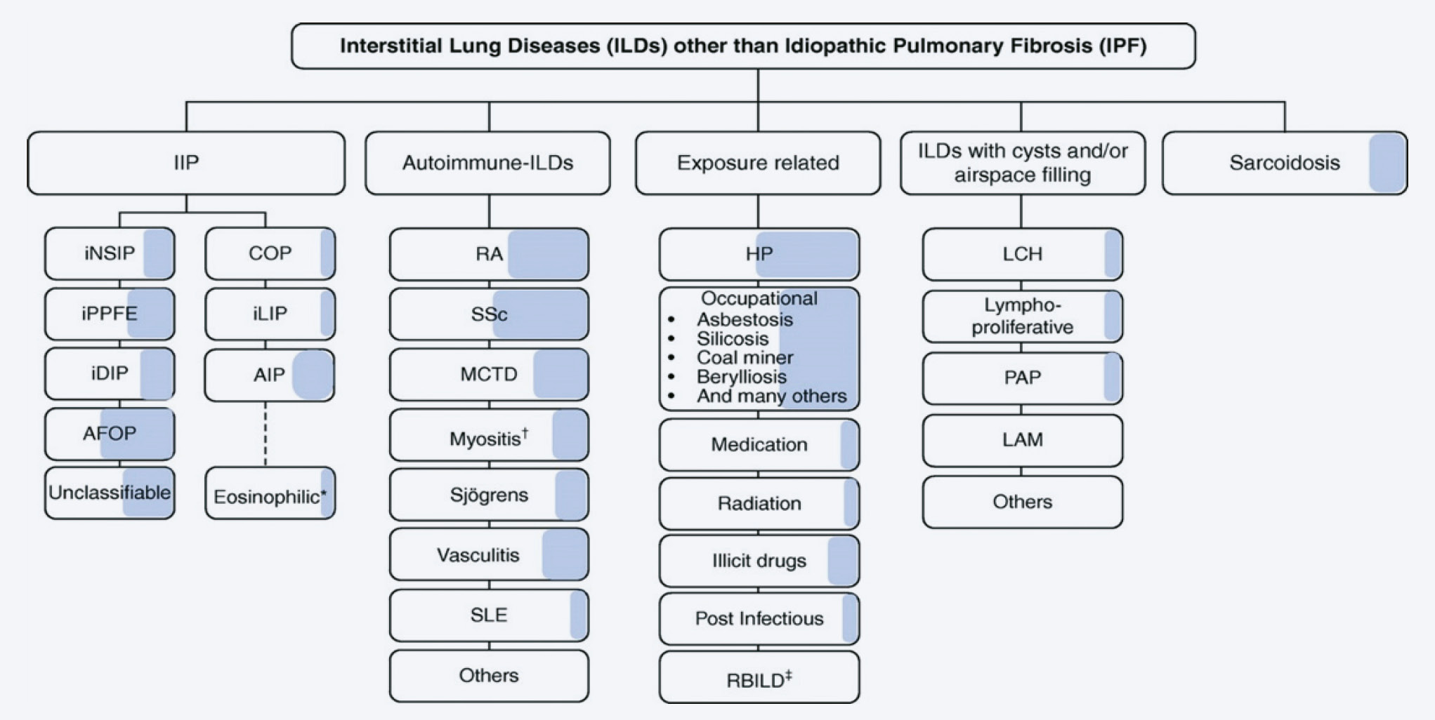 Die interstitiellen Lungenerkrankungen sind eine heterogene Gruppe von Lungenparenchymerkrankungen, wobei sich die klinische Präsentation und die radiologischen Muster der verschiedenen Ätiologien zum Teil überlappen, zum Teil aber auch deutlich unterscheiden. Diese verschiedenen Lungenparenchymerkrankungen werden gemäss geltenden Richtlinien eingeteilt. Eine Übersicht gibt die Abbildung 1a. Es werden die idiopathischen Interstitiellen Pneumonien (IIP) von Autoimmunvermittelten Interstitiellen Lungenerkrankungen, sowie der Hypersensitivitätspneumonitis, der Sarkoidose und einigen weiteren gut beschriebenen seltenen Lungenerkrankungen (z.B. LAM Lymphyngioleiomyomatose) abgegrenzt.