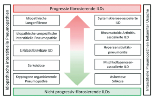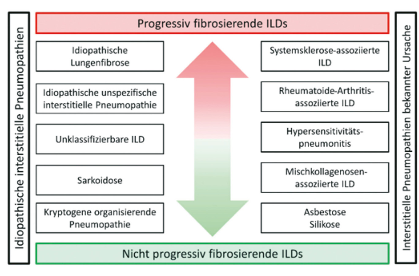 Im Kontrast dazu werden im Konzept der «Progressiven Pulmonalen Fibrose» mehrere ILDs, die sich trotz unterschiedlicher pathophysiologischer Mechanismen im Verlauf mit einer zunehmenden Fibrosierung ähnlich verhalten, zusammengefasst.