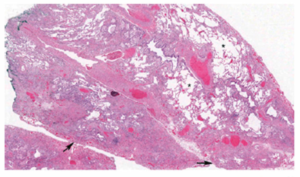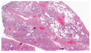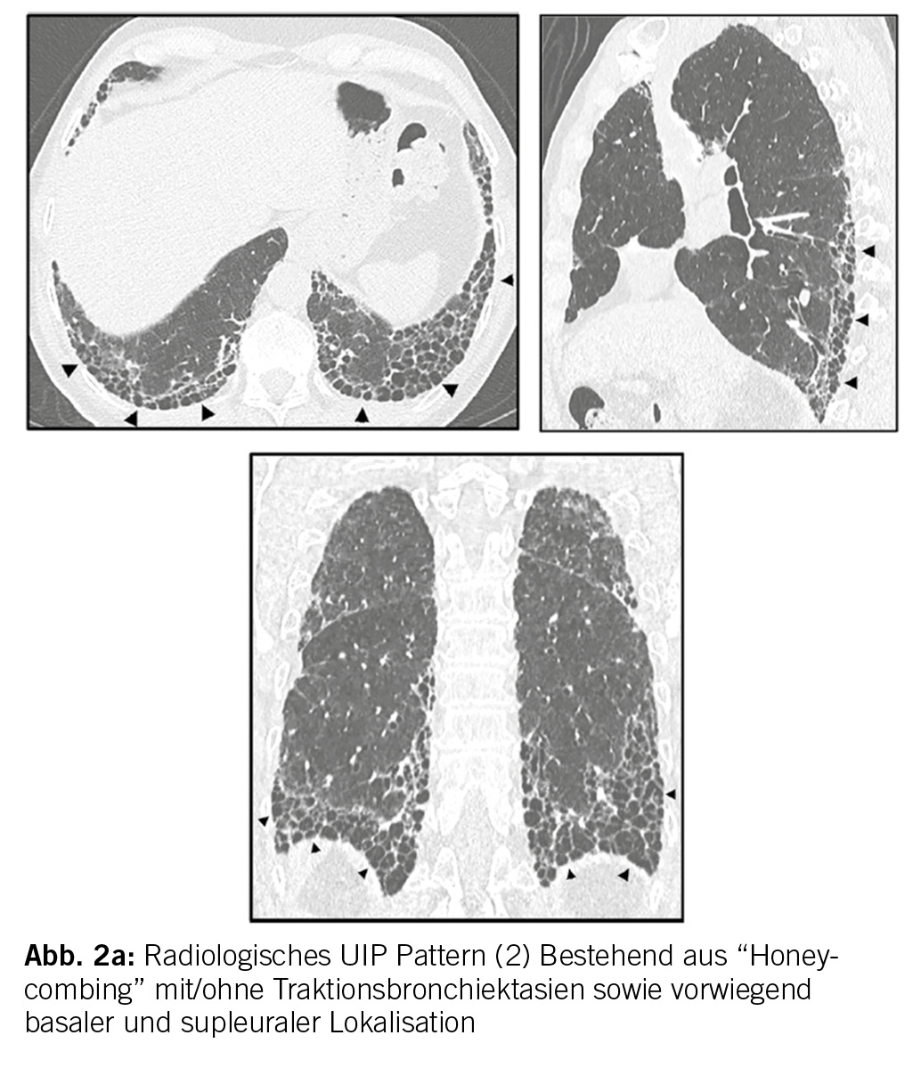 In der Bildgebung (HRCT (High resolution CT)) und/oder in den Biopsien finden wir dabei progrediente fibrotische Veränderungen. Insbesondere das Auftreten eines UIP-Pattern (usual interstitial pneumonia), siehe Abbildung 2a und 2b. geht mit einer Verschlechterung der Lungenfunktion und einer Zunahme der Morbidität und Mortalität einher.