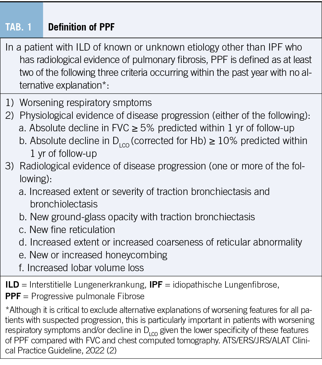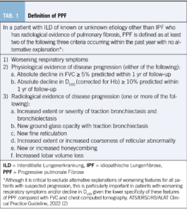 Der Phänotyp der progredienten pulmonalen Fibrosierung, definiert sich gemäss ATS Guidelines in 3 verschiedenen Kriterien (s. Tabelle 1) aus Klinik, Lungenfunktion und Radiologie. Zur Diagnosestellung einer progressiven pulmonalen Fibrose sind zwei von drei Kriterien innerhalb von 12 Monaten notwendig, eine alternative Ätiologie für die Progredienz der ILD muss ausgeschlossen sein.