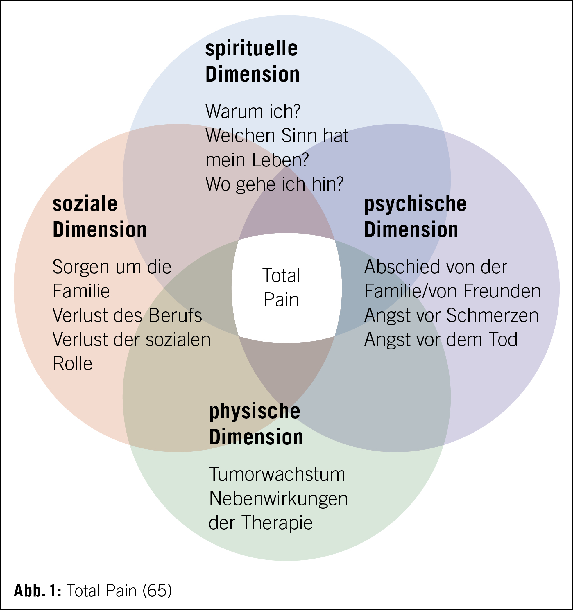 Palliative Care beugt Leiden und Komplikationen vor. Sie umfasst medizinische Behandlungen, pflegerische Interventionen sowie psychologische, soziale und spirituelle Unterstützung (14). Die spirituelle Komponente ergänzt das bio-psycho-soziale Schmerzmodell nach Engel (15). Palliative Patienten sprechen nicht nur von Schmerzen und anderen Symptomen, sondern äussern zusammen mit diesen Beschwerden auch seelische, soziale und spirituelle Not (16). Schenkt man diesen Einflussfaktoren keine oder zu wenig Beachtung, bringt die medikamentöse Behandlung womöglich nicht den gewünschten Effekt. Cicely Saunders, Pionierin der modernen Hospizbewegung und Begründerin unseres heutigen Verständnisses von Palliative Care, hat in diesem Zusammenhang in den 1960er- Jahren den Begriff des Total Pain (Abb. 1) geprägt.
