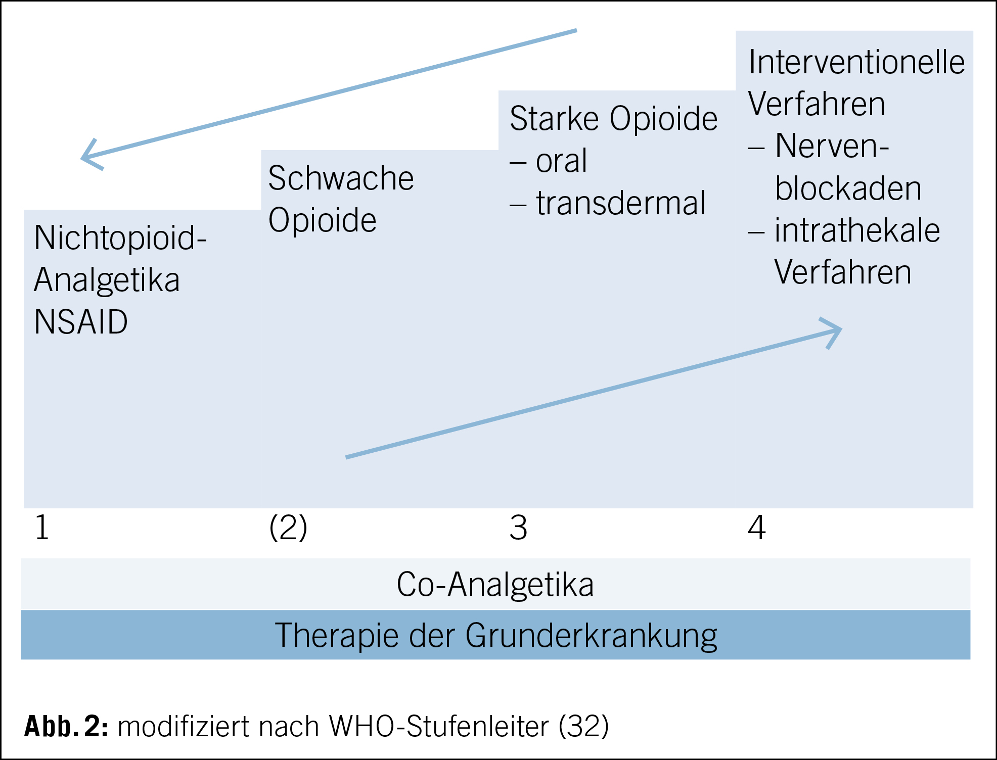 Für die Einteilung der Analgetika hat sich die WHO-Stufenleiter bewährt (Abb. 2). Diese wurde 1986 erstmals als Hilfsmittel bei Tumorschmerzen empfohlen und seither stetig weiterentwickelt. Der Einsatz hat sich auch ausserhalb des Bereichs der Tumorschmerzen etabliert. Hierbei entspricht Stufe 1 Non-Opioiden, Stufe 2 und 3 den schwachen bzw. starken Opioiden. Zu den drei genannten Stufen wurde eine vierte hinzugefügt, welche interventionelle analgetische Verfahren beinhaltet, wie bsp. die intra­thekale Schmerztherapie. Zudem wurde die Medikamentengruppe der Co-Analgetika hinzugefügt. Von einem initial unidirektionalen Einsatz ist man zu ­einem bidirektionalen Einsatz übergangen (32).