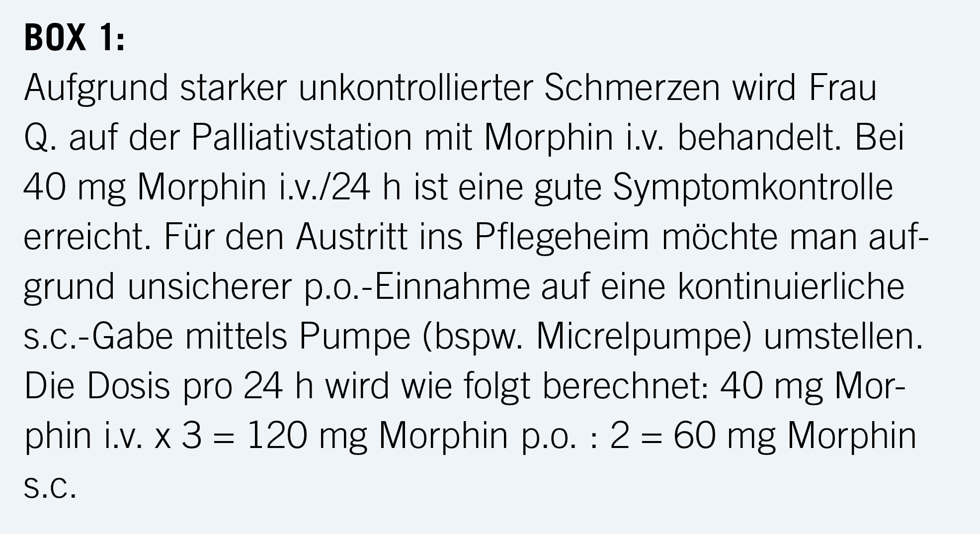 05) Die benötigte Gesamtdosis der Reserveboli pro 24 Stunden kann am nächsten Tag zur fixen Tagesdosis dazugerechnet werden. Bsp.: Wenn ein Patient mit 2 x 15 mg retardiertem Morphin die letzten 24 Stunden 3 Reserveboli à 3 mg Morphin benötigte, kann die Tagesdosis auf 2 x 20 mg des retardierten Morphins erhöht und die Reservedosis auf 4 mg kurzwirksames Morphin angepasst werden. Die Tagesdosis soll maximal um 50 % erhöht werden.