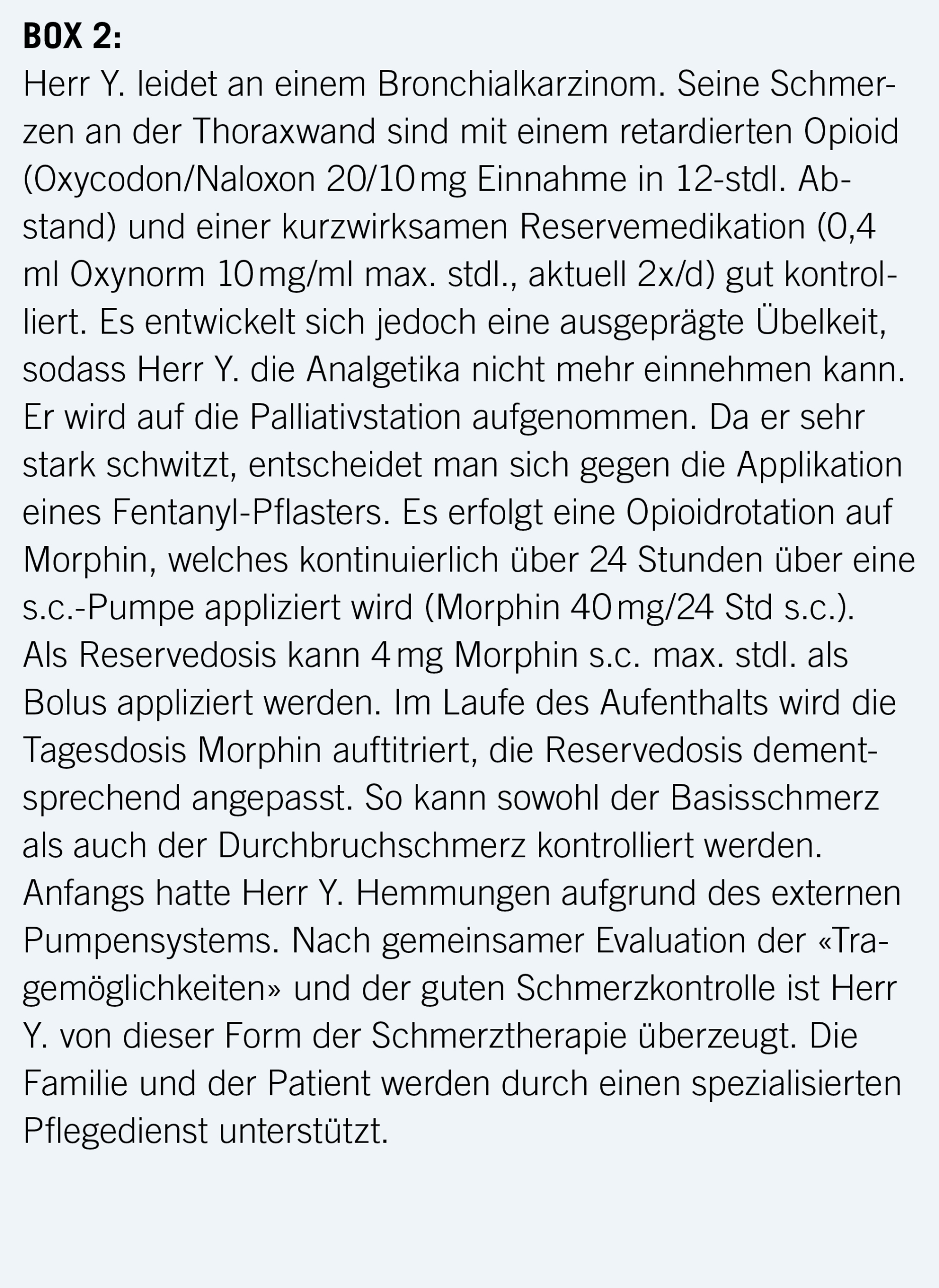 Im Folgenden soll noch auf zwei der starken Opioide gesondert eingegangen werden. Methadon ist wegen seiner stark variablen Halbwertszeit, seiner komplexen Dosierung, seiner unter anderem kardialen Nebenwirkungen und möglicher Stigmatisierung (Einsatz bei Opioid-Agonisten-Therapie) ein Molekül, das nur von Ärztinnen und Ärzten mit entsprechender Erfahrung angewendet werden soll (29). Buprenorphin als gemischter Agonist-Antagonist wird zur Analgesie in der Palliativmedizin sehr selten angewendet.