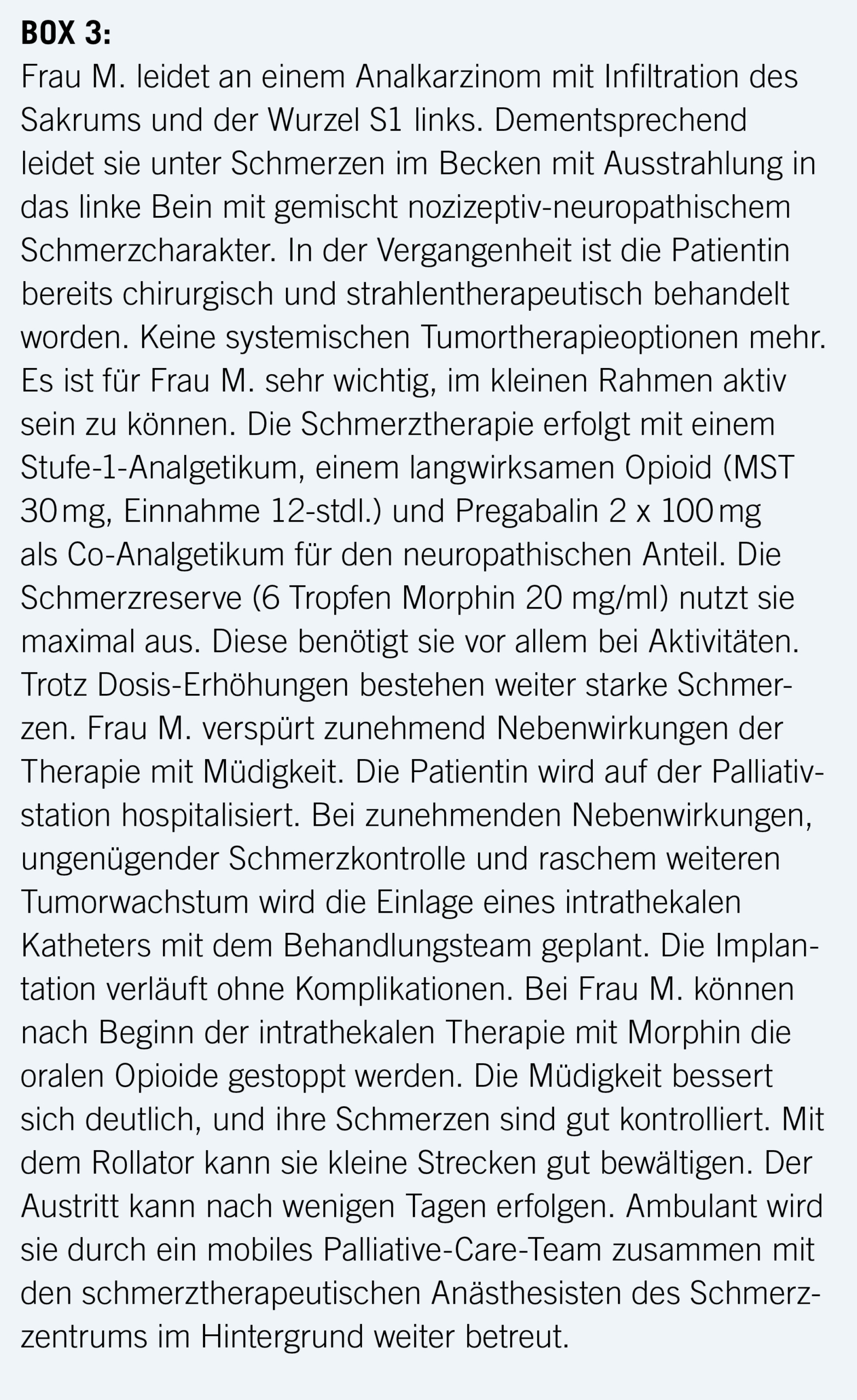 Vor einer Implantation müssen psychiatrische Erkrankungen ausgeschlossen bzw. stabilisiert sein, ebenso sollte eine Total-Pain-Komponente beachtet werden. Für eine Implantation ist immer ein stationärer Aufenthalt mit Abstimmung der involvierten Disziplinen notwendig. Auch muss die weitere ambulante Betreuung durch spezialisierte Pflegedienste und ein schmerztherapeutisch anästhesiologisches Team gewährleistet sein (BOX 3) (4).