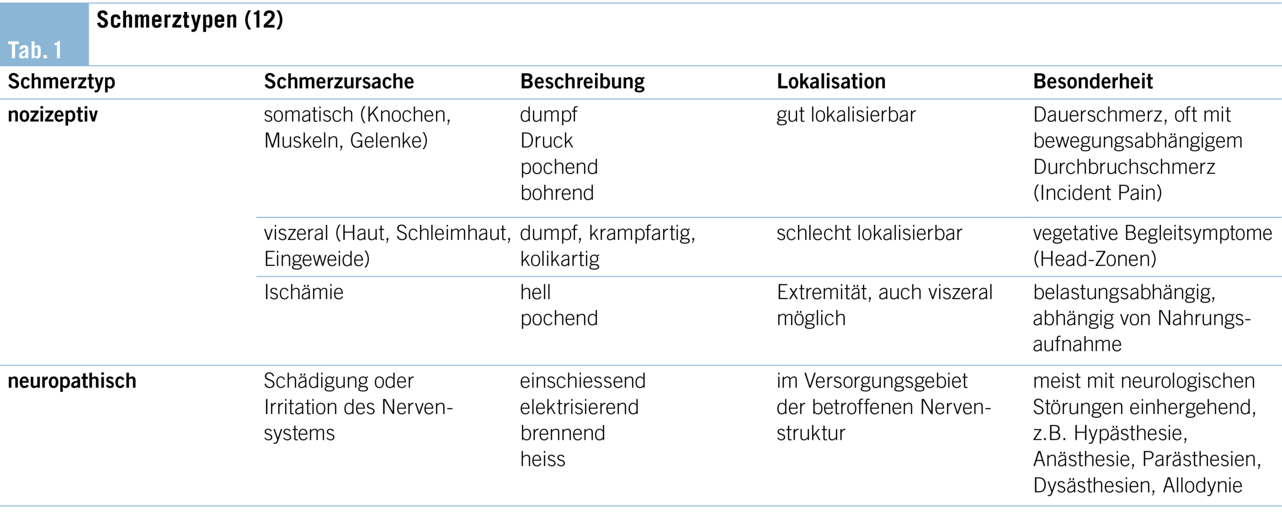 Je nach Ursache des Schmerzreizes spricht man von nozizeptivem und neuropathischem Schmerz (Tab. 1). Nozizeptoren sind rezeptive Strukturen auf der Oberfläche freier Nervenendigungen, welche die Stärke und den zeitlichen Verlauf u.a. von mechanischen und thermischen Reizen messen, welche kortikal als Schmerz wahrgenommen werden (11). Nozizeptoren kommen nahezu in allen Organen vor, mit grösster Dichte in der Haut, nicht aber im Gehirn und in der Leber. Die Nozizeptoren der inneren Organe vermitteln einen oft dumpfen, schlecht lokalisierbaren Schmerz, der auf Hautareale übertragen werden kann, die von demselben Rückenmarkssegment innerviert werden wie das schmerzende Organ. Diese Hautzonen werden als Head-Zonen bezeichnet (12).