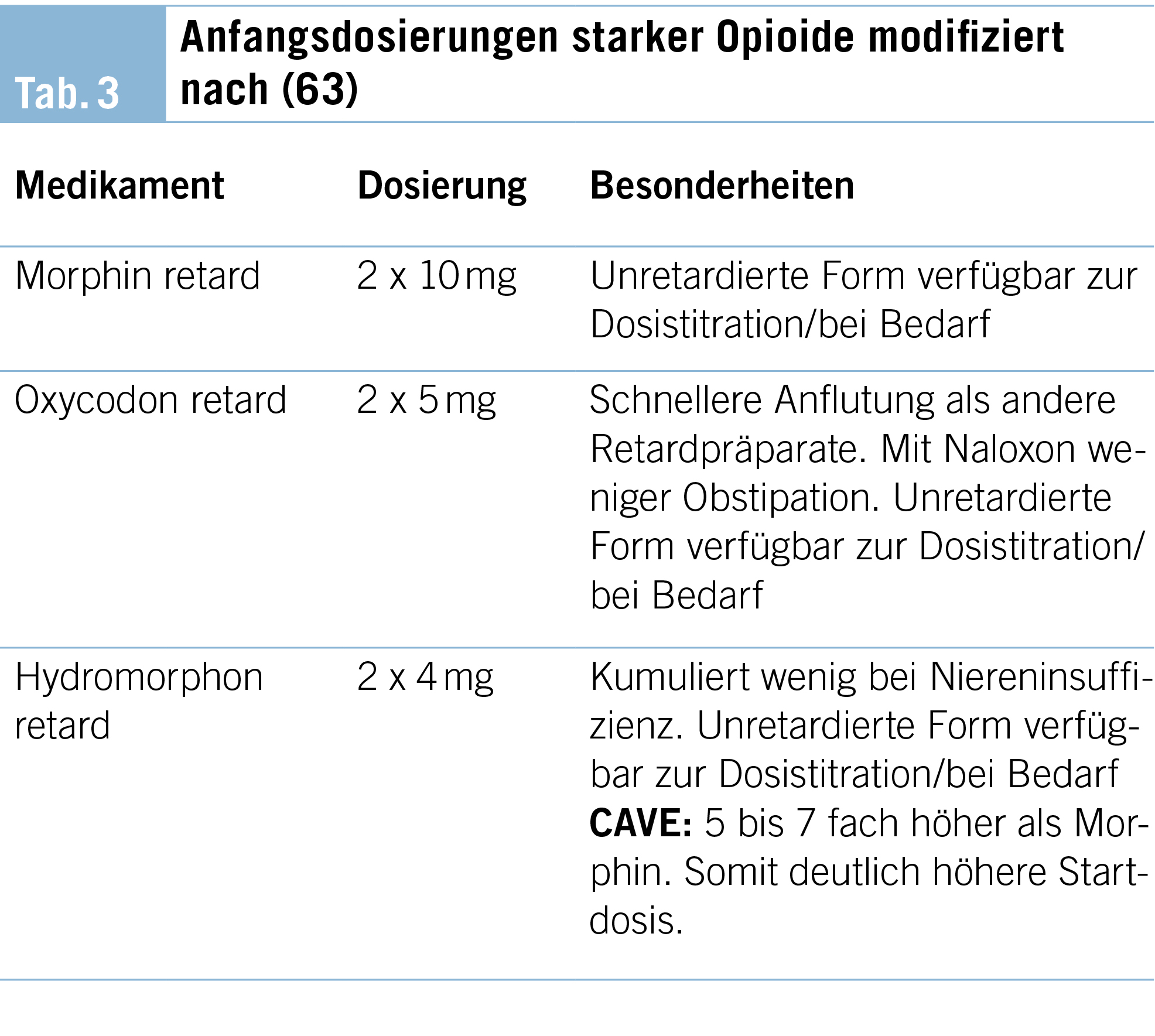 02) Start low – go slow: Mit tiefer Dosis starten, eintitrieren, bis das therapeutische Fenster (gute Analgesie mit minimalen Nebenwirkungen) erreicht ist (Tab. 3)