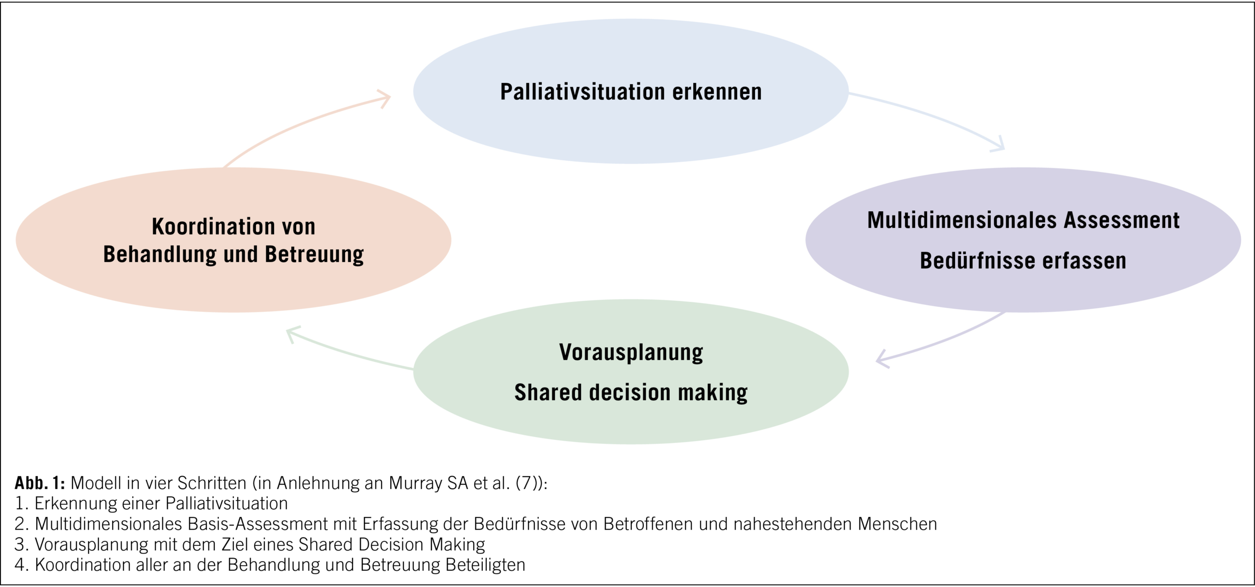 Es gehört zu den Aufgaben von in der Grundversorgung tätigen Ärzt/-innen sowie Pflegenden, bei fortschreitenden Erkrankungen daran zu denken, dass eine Palliativsituation vorliegen könnte, und entsprechende Schritte einzuleiten. Am ehesten wird man bei einem Menschen mit einem fortgeschrittenen Tumorleiden daran denken, dass die oben genannten Bedürfnisse vordringlich werden; daran denken sollte man aber auch unter anderem bei Menschen mit einer höhergradigen chronischen Herzinsuffizienz, mit einer raschen atembedingten Erschöpfung bei einer COPD, gehäuften Stürzen bei einem Morbus Parkinson oder auch einem ungewollten nennenswerten Gewichtsverlust bei einer Demenzerkrankung.