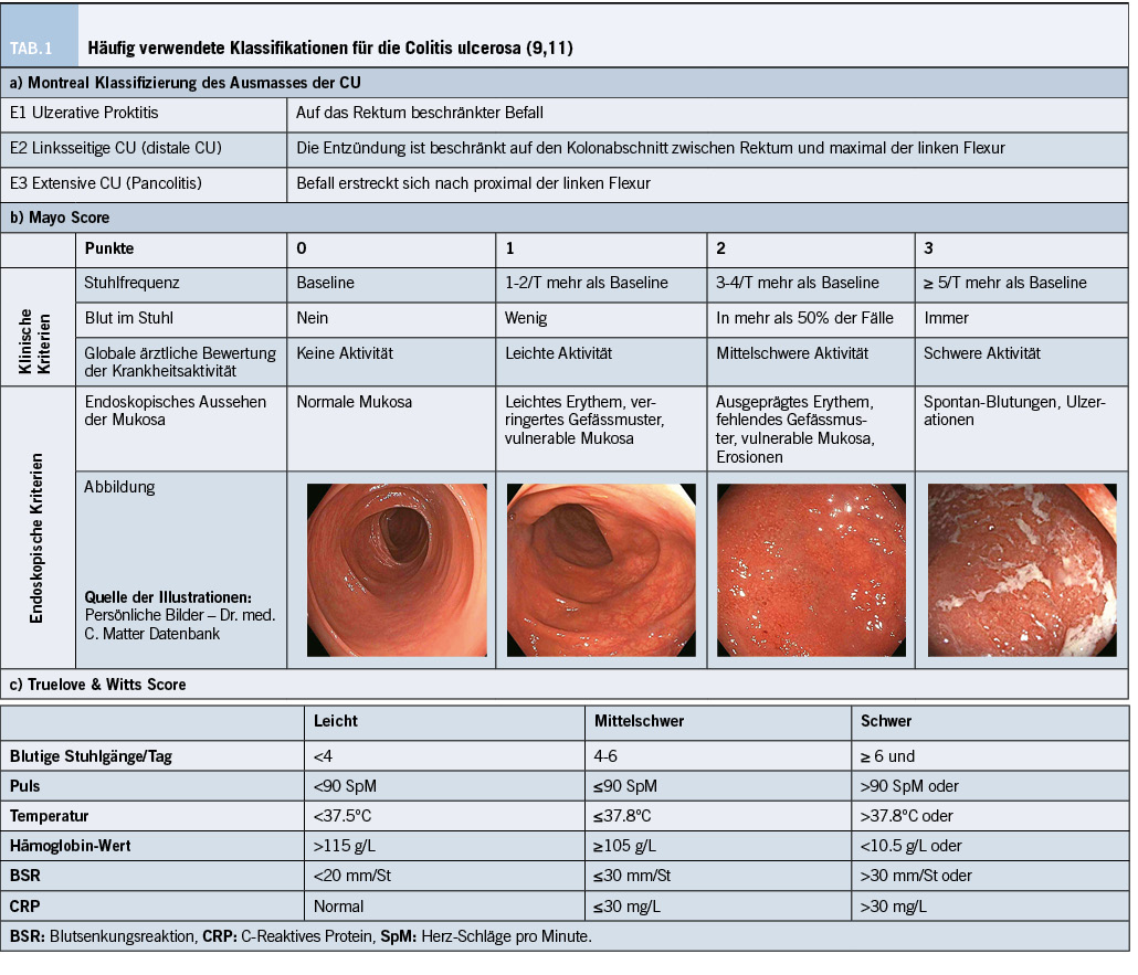 Labortechnisch können eine Anämie und ein Vitaminmangel vorliegen. Die intestinale Entzündung lässt sich durch einen pathologisch erhöhten Calprotectin-Wert im Stuhl messen. Aufgrund des oberflächlichen, mukosalen Befalles der CU kann der CRP-Wert trotz einer ausgedehnteren Colitis Ulcerosa noch normal oder tief-normal ausfallen. Das CRP ist hingegen sehr nützlich als Marker für einen schweren Verlauf der Colitis, gemäss den Kriterien nach Truelove & Witts (Figur 1c) (9). Das toxische Megakolon, das durch eine nicht obstruktive Kolon-Dilatation von ≥5.5cm definiert ist, stellt eine gefürchtete Komplikation dar, die rasch erkannt und behandelt werden muss, da sonst eine Perforation auftreten kann (7,10). Je nach Klinik muss eine abdominale Bildgebung, z.B. mit einem CT – Abdomen, zur Suche nach einer solchen Komplikation durchgeführt werden (7).