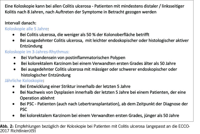ven Messung (Calprotectin Bestimmung im Stuhl) proaktiv gesucht werden sollte (10). Bei den klinischen Verlaufskontrollen wird empfohlen, mittels Blutentnahme Nebenwirkungen der IBD-Therapie zu suchen und auch eine Anämie und einen Vitaminmangel im Rahmen der entzündlichen Erkrankung auszuschliessen. Mittelfristig ist es wichtig, dass der Patient an einem Darmkrebs-Screening teilnimmt, welches ca. 6-8 Jahre nach der Erstdiagnose begonnen werden sollte und dann (je nach Risikofaktoren) alle 1 bis 5 Jahre durchgeführt wird (6). Abbildung 2 fasst die aktuellen Empfehlungen der ECCO zu diesem Thema zusammen.